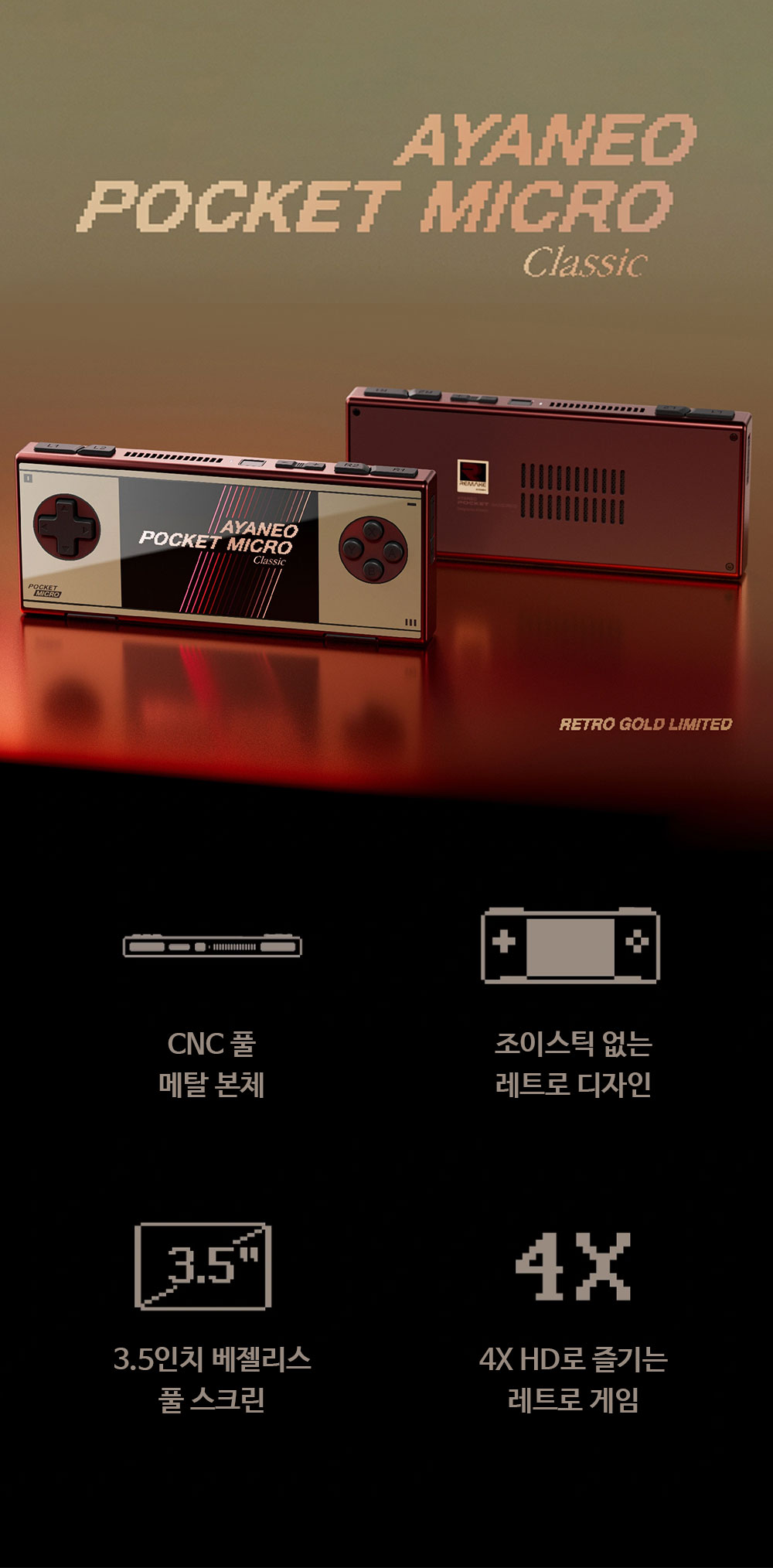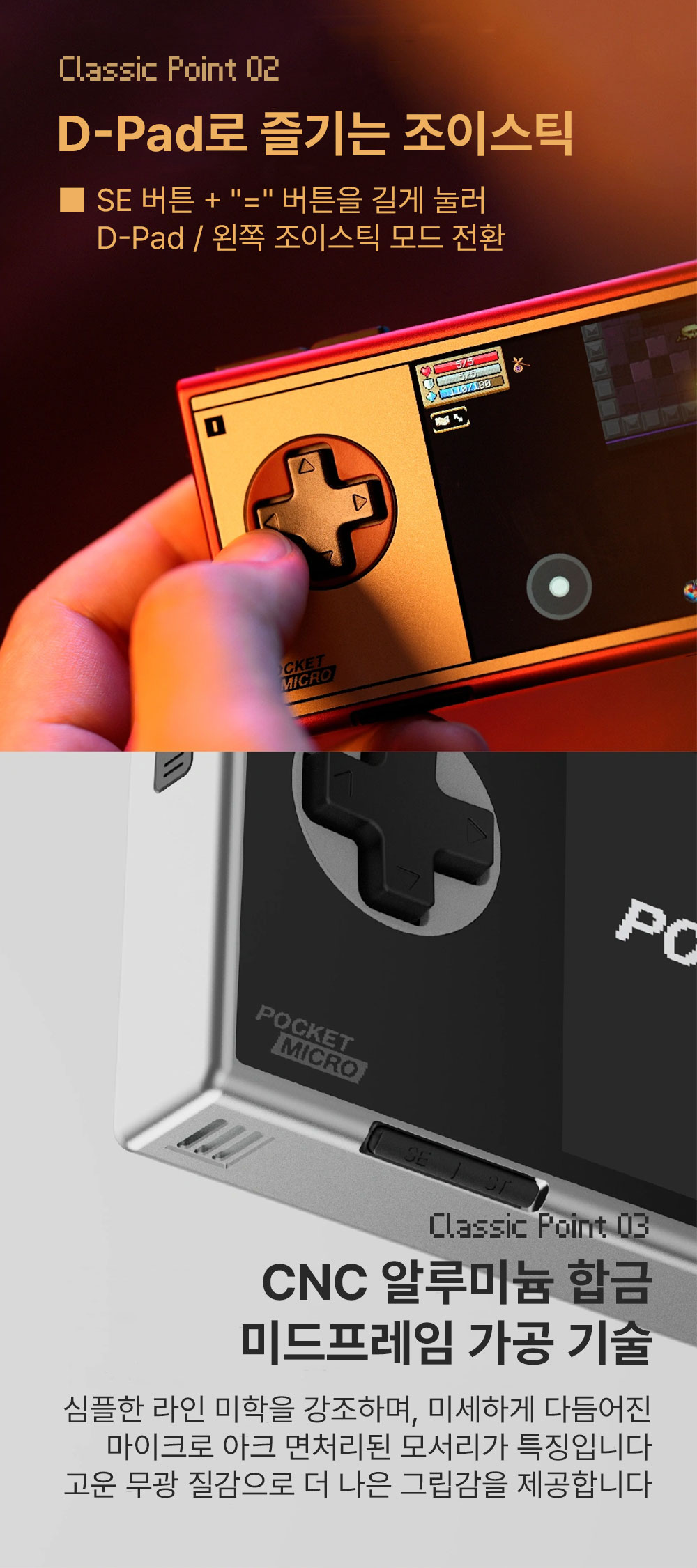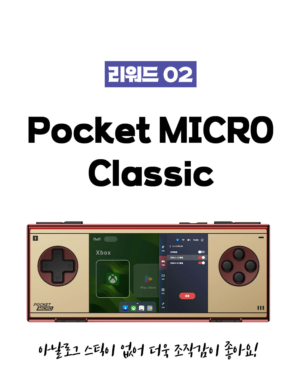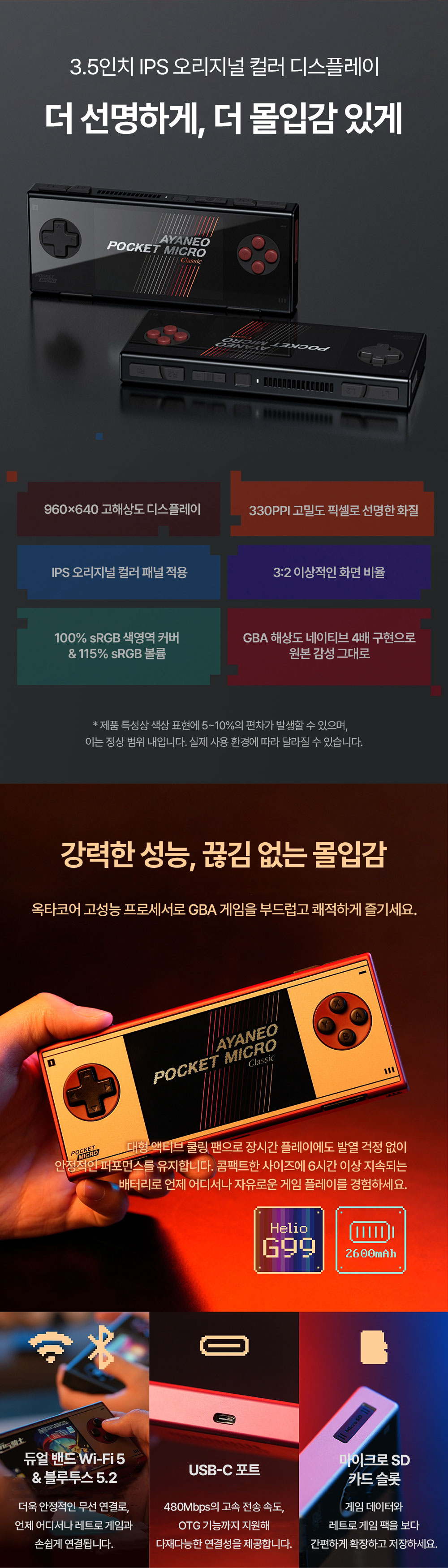 1. 🎮 닌텐도 감성 소형 안드로이드 게임기 - 닌텐도 게임보이 미크로 오마주, 최신 사양 탑재 2. 🕹️ 레트로 감성·미니멀 디자인 결합 - 컴팩트한 크기로 휴대성 우수, 고전 게임 완벽 지원 3. 🎁 와디즈 한정 사은품 증정 - 정품 파우치와 강화 유리 필름 포함, 국내 공식 A/S 지원
