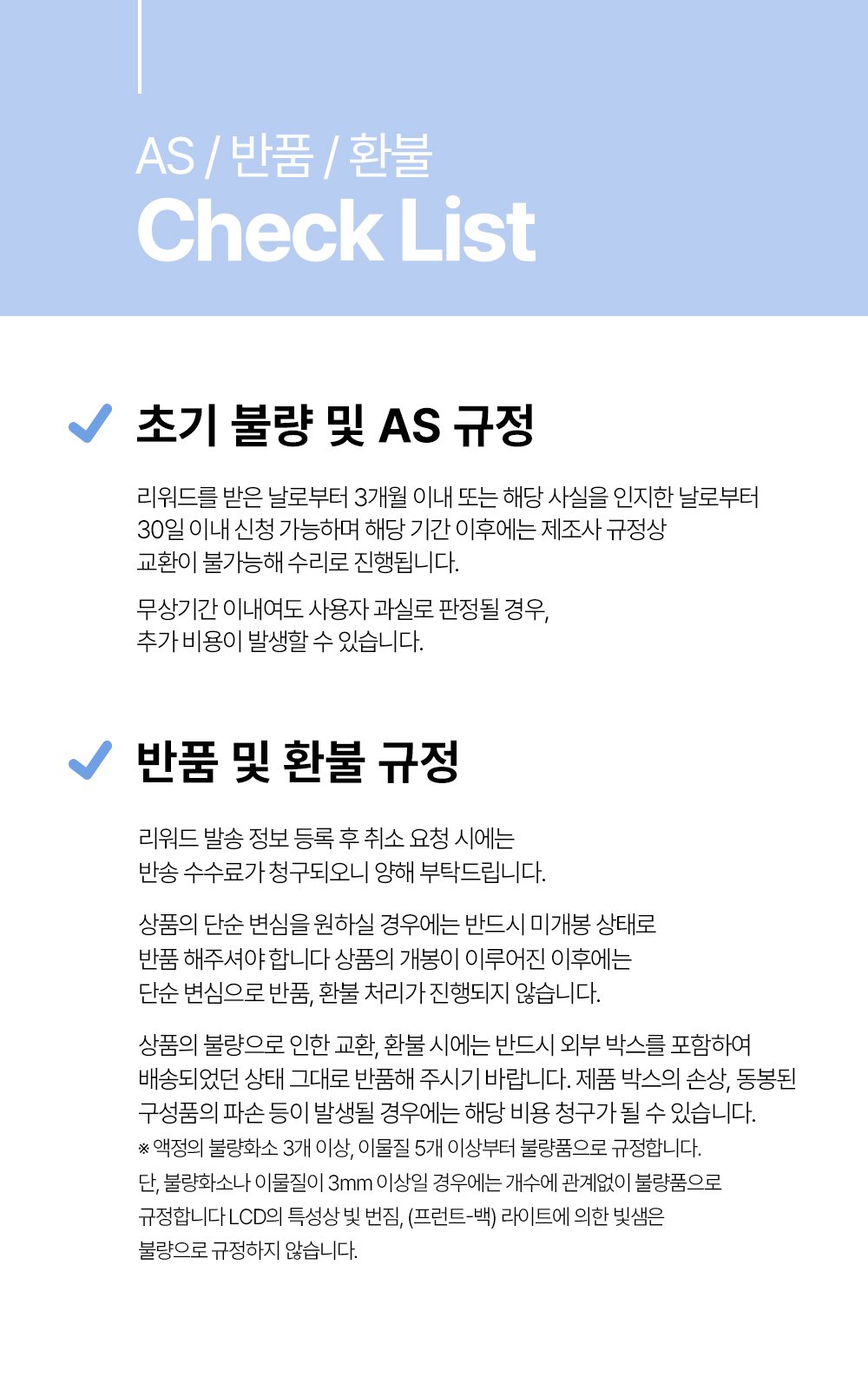 • 배송 문의 상담 가능한 시간 : 평일 오전11시 - 오후 4시(주말,공휴일 휴무)
