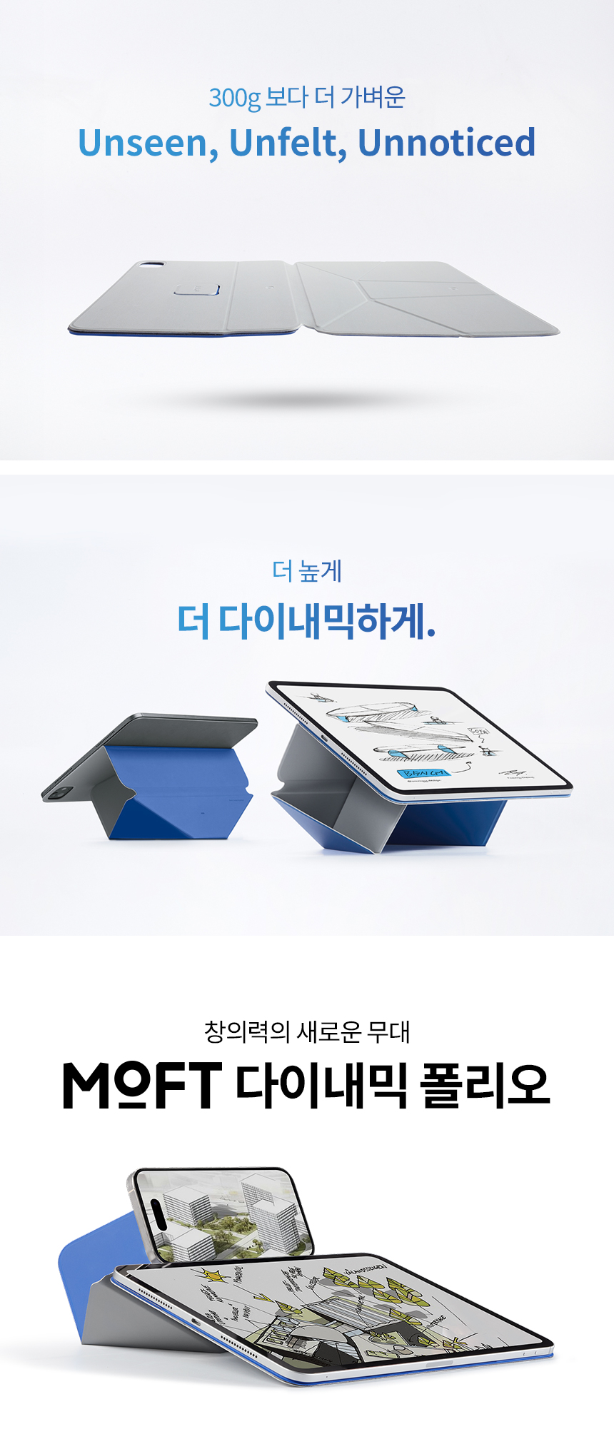 그래서 MOFT는 종이접기에서 영감을 받은 클래식한 디자인을 활용해, 아이패드를 사용하는 모든 분들이 어디서든 작업하고 창작할 수 있도록 하나의 솔루션을 제안합니다.