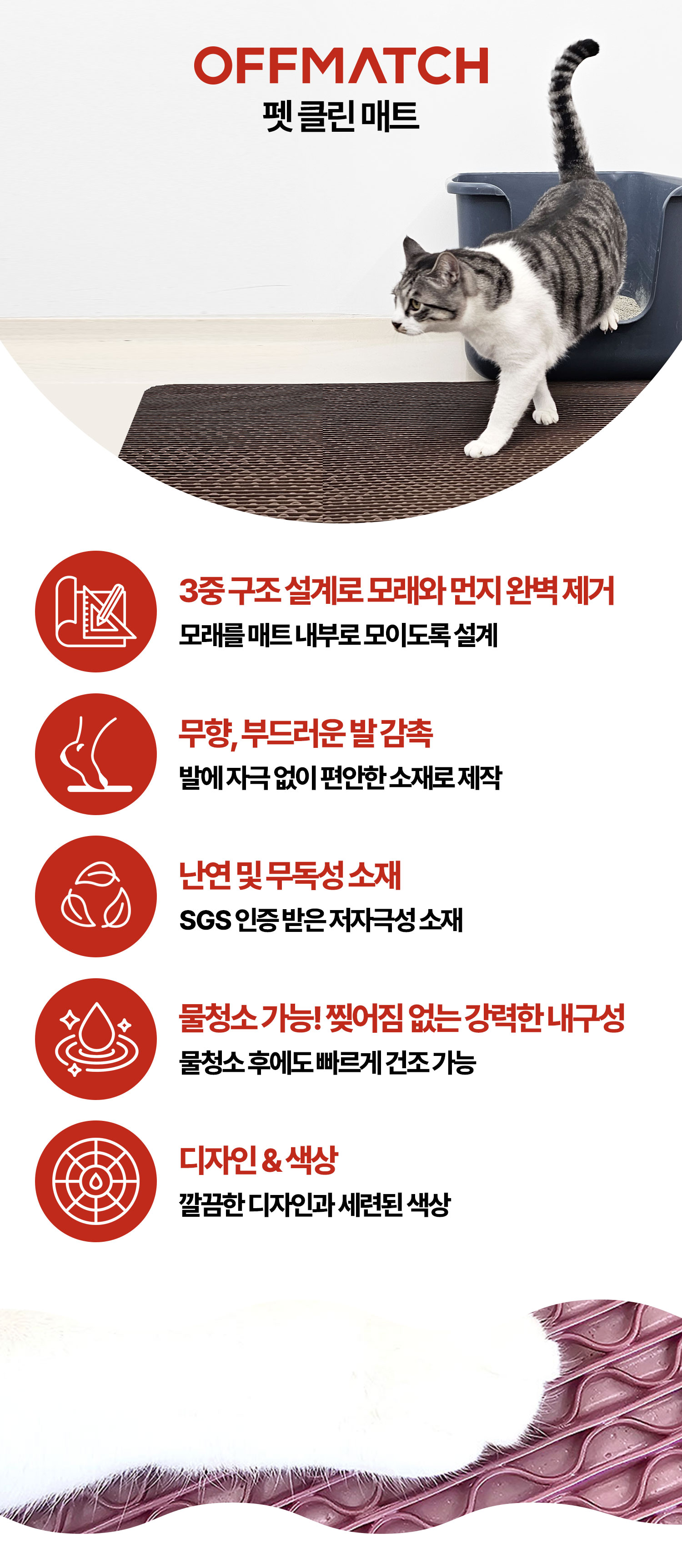 오프매치 펫 클린 매트는 고양이 발바닥에 부담 없는 부드러운 표면으로  고양이가 거부감 없이 사용할 수 있습니다.
