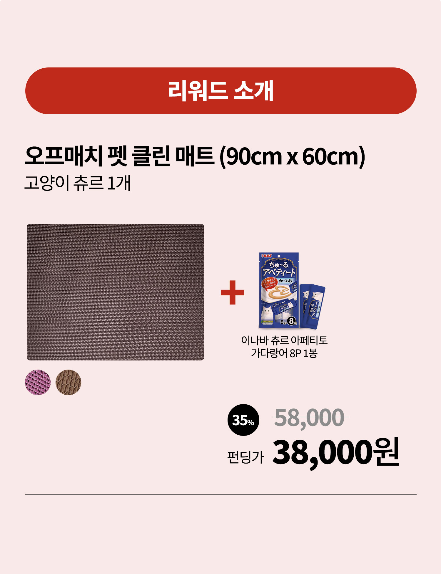 1. 🐱 고양이 전용 사막화 방지 매트 - 3중 구조와 연질 PVC로 먼지와 모래 효과적 포집 2. 🌿 SGS 친환경 인증 안전 소재 - 유해 물질 무검출, 고양이와 사람이 안심 사용 가능 3. 🎁 펀딩 한정 할인 및 고양이 츄르 세트 - 넉넉한 크기 매트와 츄르 간식 포함 35% 할인 제공