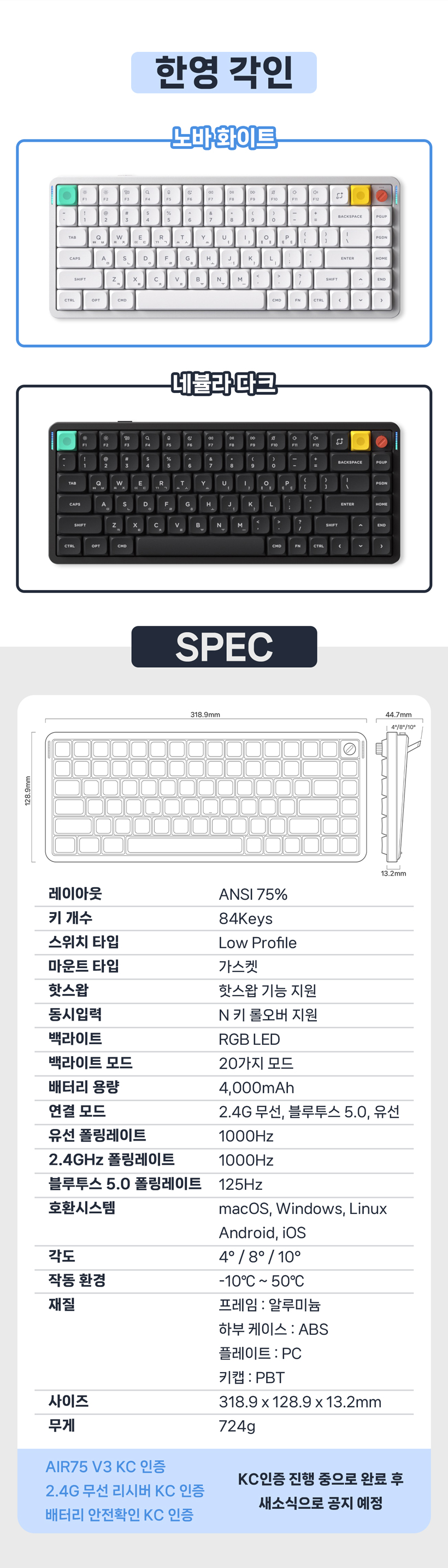AIR75 V3 모델은 NUPHY에서 출시한 AIR 시리즈 기계식키보드의 3세대 버전으로 전세계 유저 분들께 가장 많은 사랑을 받은 모델입니다. 이번 3세대에 적용된 NUPHY.IO 프로세스로 전력 관리 부분에서 비약적인 사용 시간을 업그레이드 하였으며, 노브 모듈의 적용으로 기존 기계식키보드에서 볼 수 없었던 모듈 커스텀형 키보드를 AIR V3에서 경험해볼 수 있습니다. KICK 모델에서 처음 적용된 나노 스위치를 AIR V3에도 적용하여 로우 프로파일 기계식 키보드에서 하이 프로파일의 타건감을 구현하였으며, 가볍고 휴대성이 좋은 기계식키보드가 하이 프로파일 키보드와 비교하여도 부족하지 않은 타건감, 타건음, 성능적 스펙을 자랑합니다.