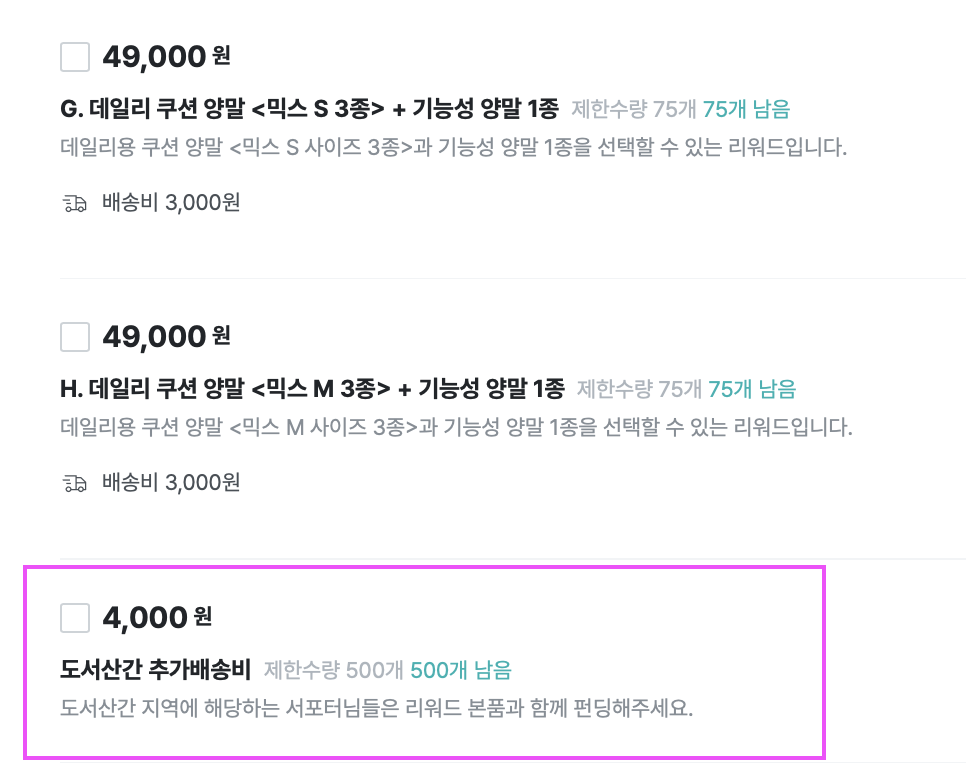 꼭! 리워드 선택 후 <도서산간 추가배송비>를