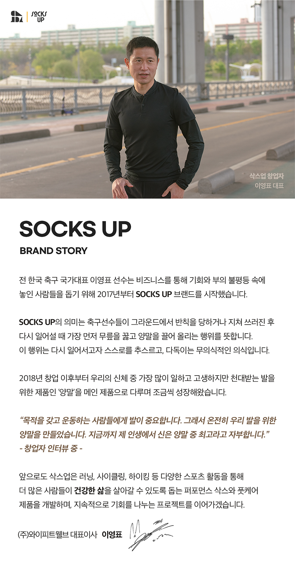 그리고 그런 마음에 공감해 준 브랜드가 바로 삭스업이었습니다. 삭스업은 “발끝에서 시작되는 변화”를 꿈꾸며, 축구선수 이영표 선수가 최고의 기술과 품질을 담아 건강하고 편안한 착용감을 주는 양말을 판매하는 전문 브랜드입니다. 단순히 제품을 파는 것을 넘어서 사람의 일상과 삶의 질을 생각하는 브랜드 철학이 있었고, 그 방향성이 저희와 많이 닮아 있었습니다.