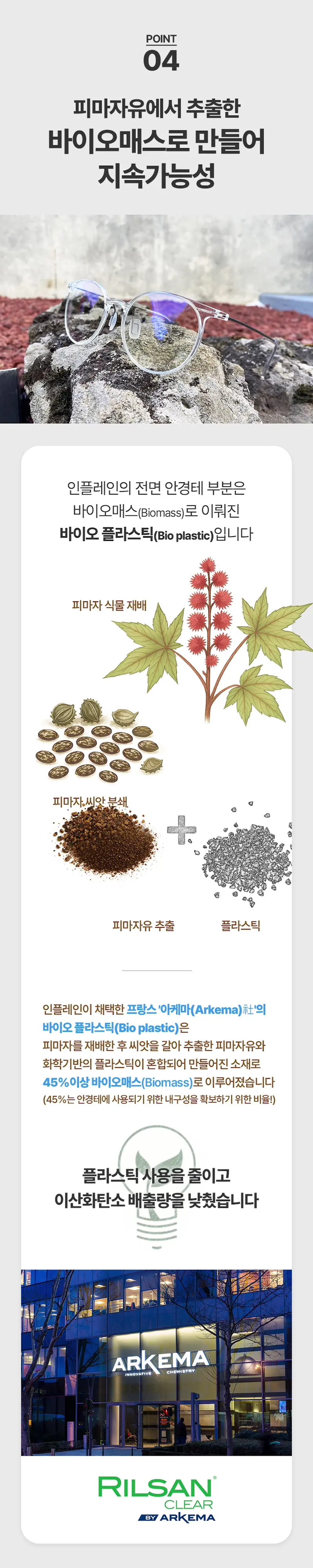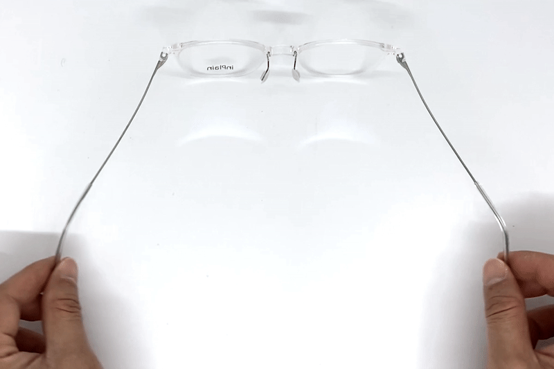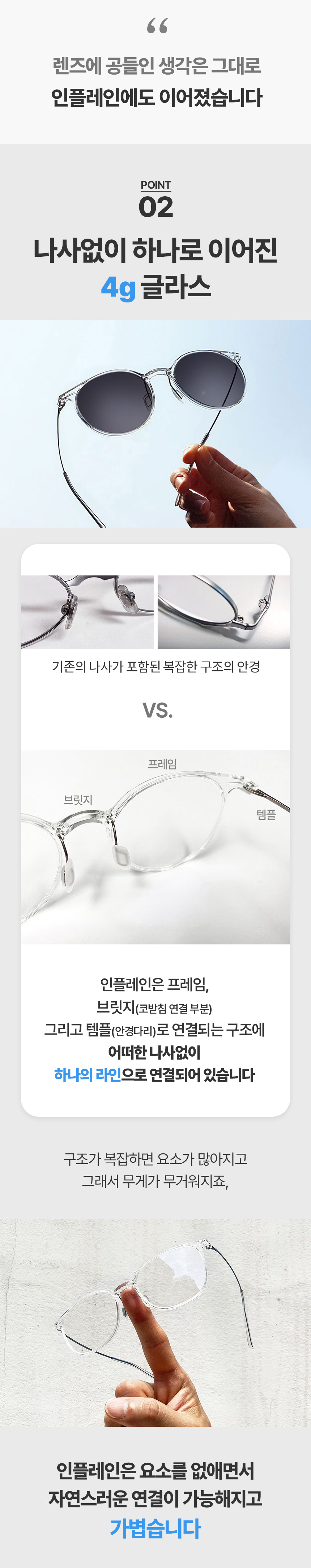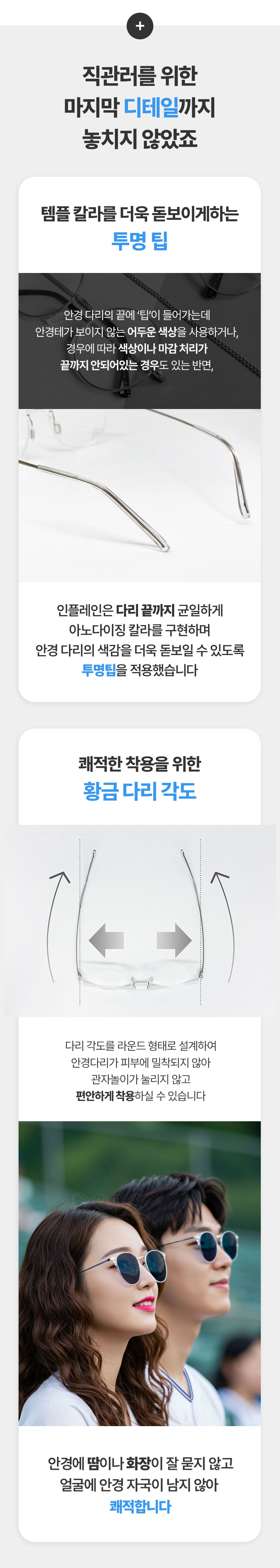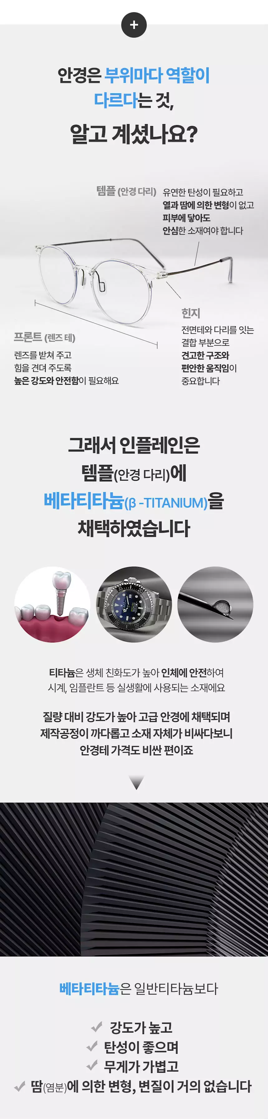 인플레인의 베타티타늄 템플은 탄성과 복원력이 높아 당기거나 잡아당겨도 무리없이 다시 형태가 복원되며 얼굴에 맞게 휘어져 착용감이 편안합니다