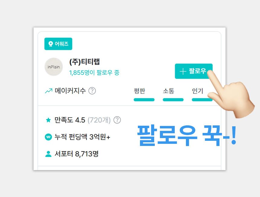 프로젝트 상단의 '메이커 팔로우' 하면 인플레인의 소식을 가장 먼저 받아보실 수 있습니다 :)