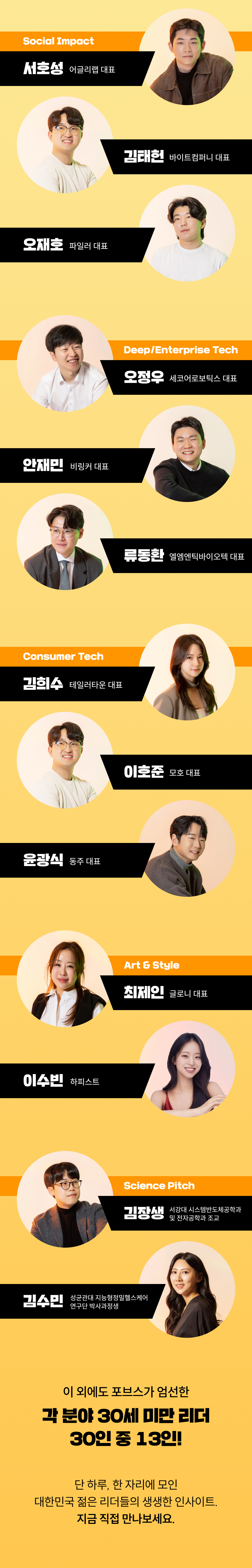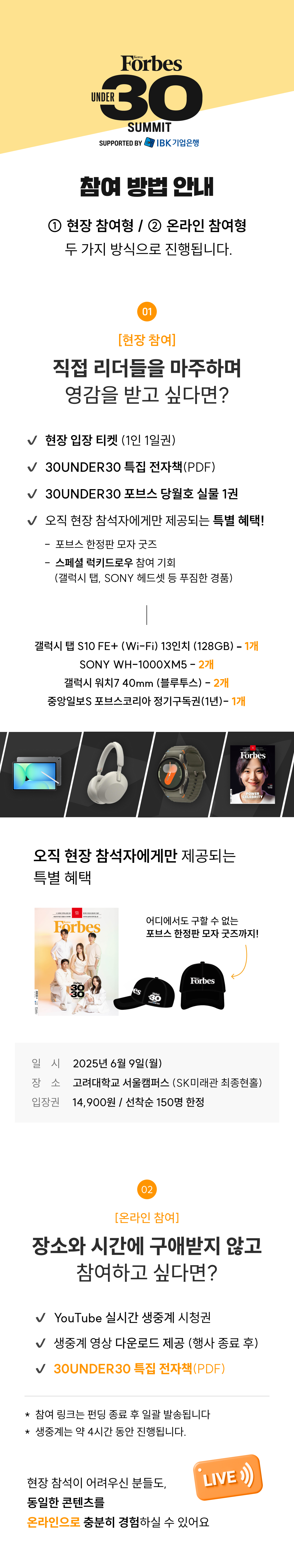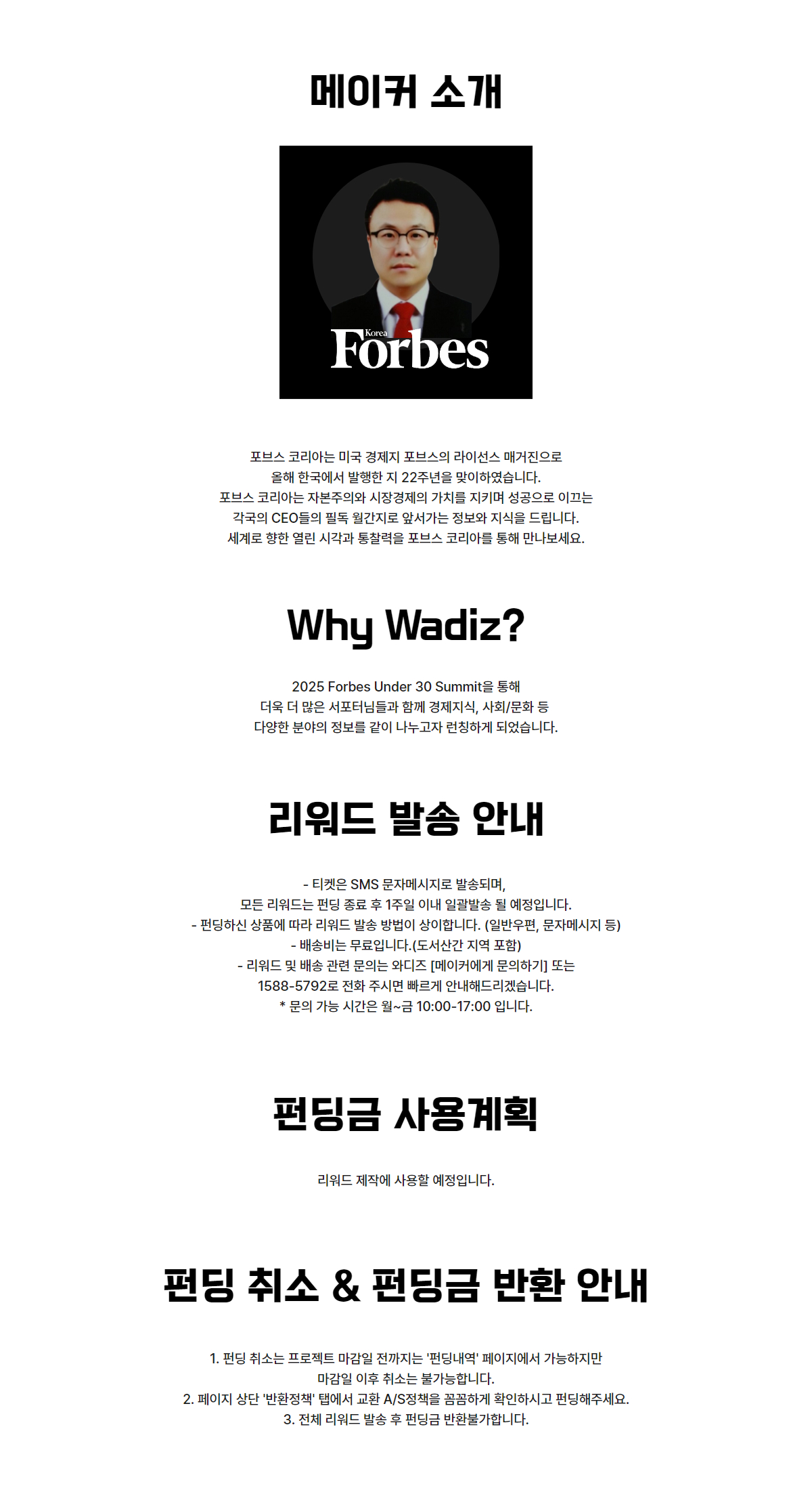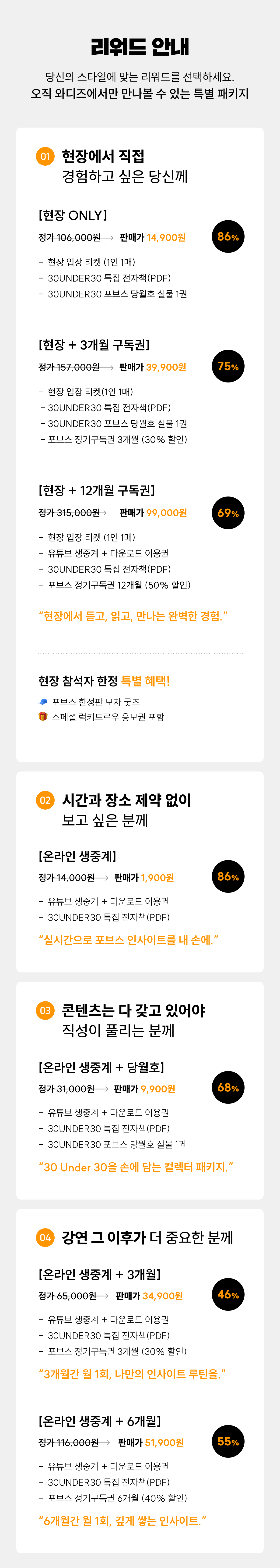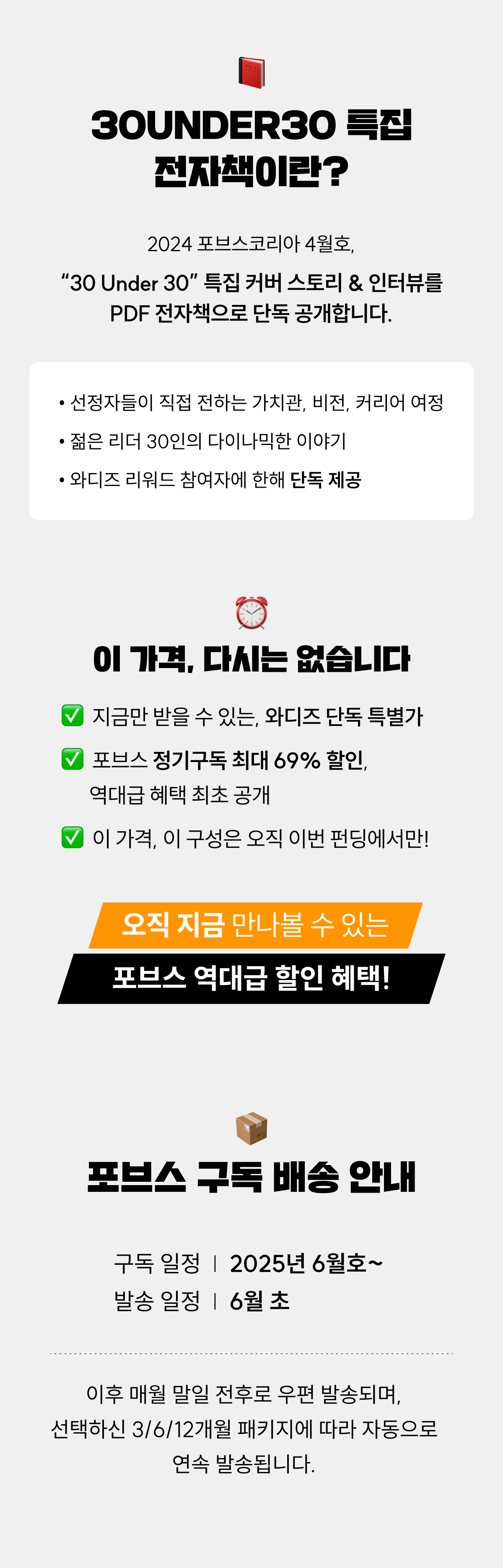 1. 📚 포브스 30 Under 30 인사이트 - 젊은 리더 30인의 커리어 설계법을 한자리에 공개 2. 🌍 글로벌 젊은 리더 서밋 - 세계 각국 30세 이하 리더들의 혁신과 소통 기회 제공 3. 🎟️ 한정판 구독권 할인 - 와디즈 단독 최대 69% 할인 및 한정판 굿즈 제공
