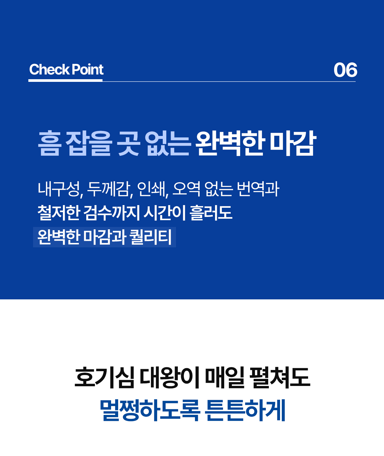 제조 및 유통 과정에서 발생할 수 있는 미세한 스크래치, 실밥 노출, 책 무게로 인한 눌림 자국 등은 제품의 기능과 품질에 영향을 주지 않는 범위 내로, A/S(교환 및 반품) 대상에 해당하지 않습니다.이는 모든 고객님께 동일한 기준을 적용하고자 마련된 기준이오니, 구매 시 참고 부탁드립니다.