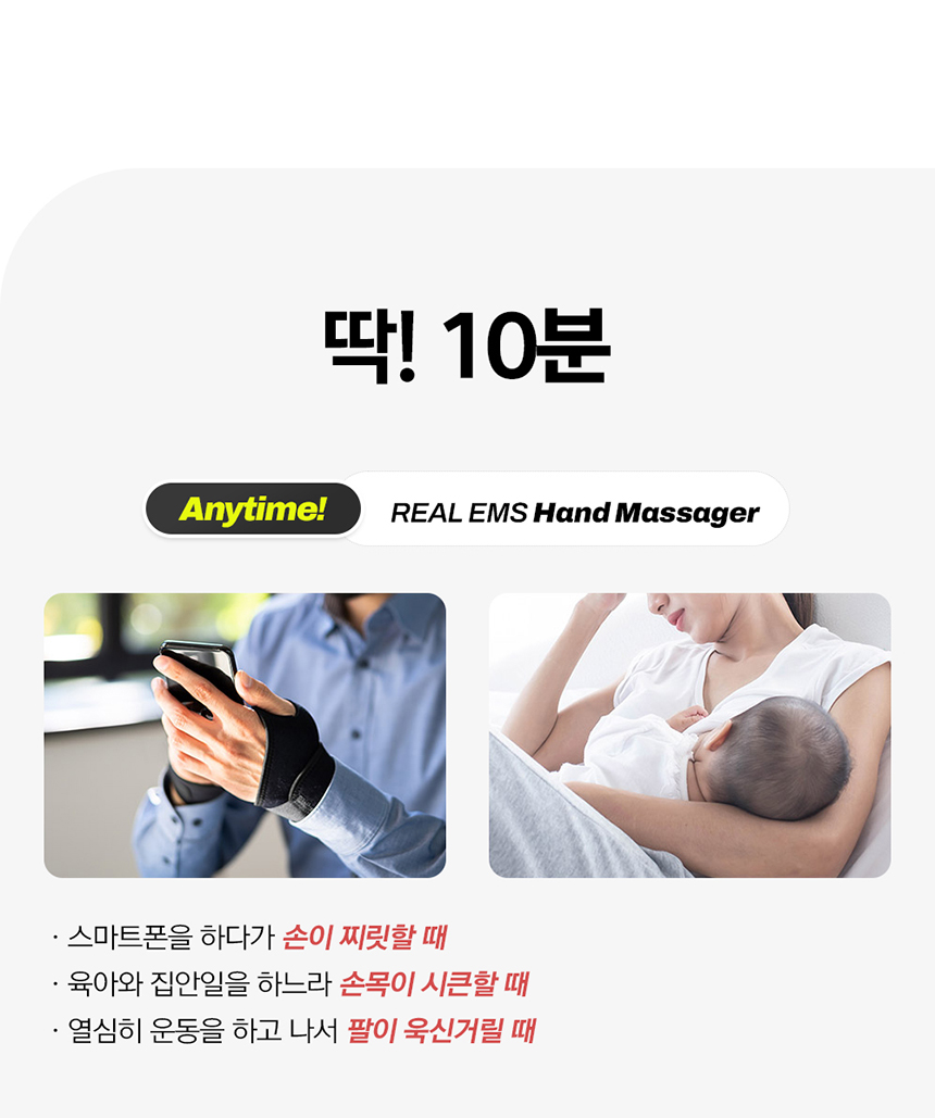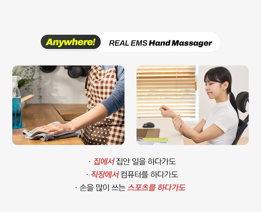 리얼EMS 핸드 마사지기는 오로지 손 건강만을 위해 설계된 EMS 운동 및 마사지기입니다.