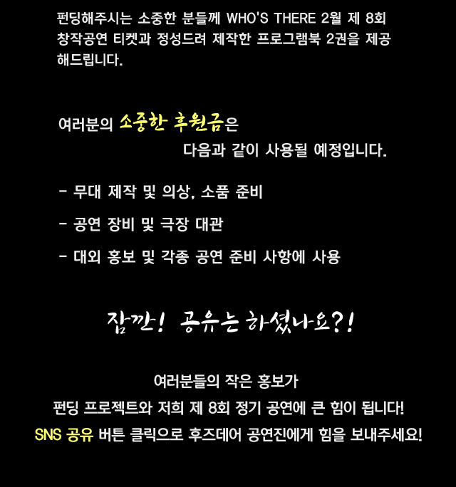 저희 후즈데어(who's there)는 대학생들이 모여서 창작공연을 만드는 아주 어메이징한 팀입니다. 극작, 뮤지컬 넘버, 무대, 소품, 기획, 홍보,등 다양한 분야의 관심있는 학생들이 모여서 세상에 없던 신선하고 즐거운 공연을 만들어가자는 취지로 진행이 되고있습니다.
