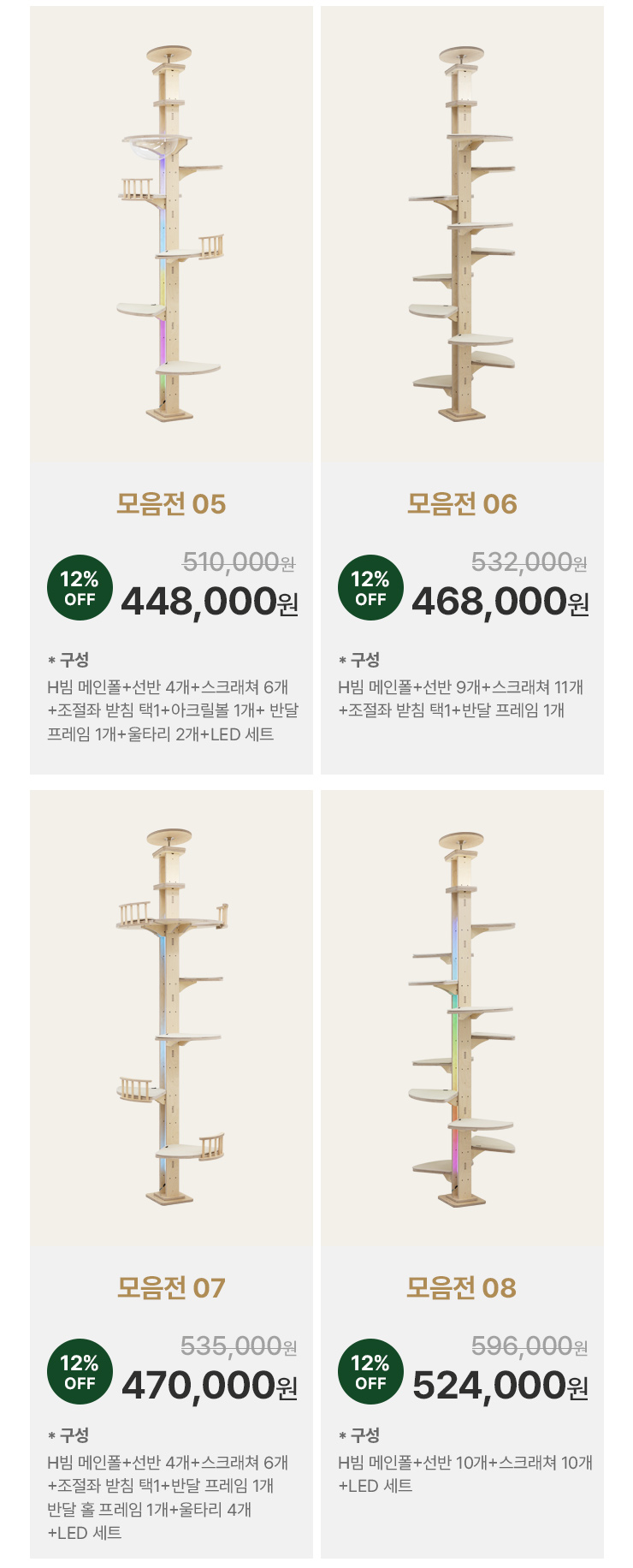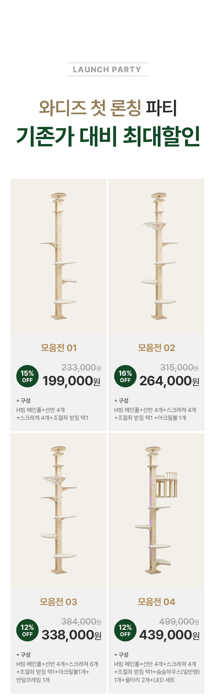 1. 🐱 키보 원목 캣폴 캣타워 - 자작나무 원목 사용, 안전하고 편안한 고양이용 캣타워 2. ✨ LED 조명 기능 탑재 - 냥환장 LED로 고양이 흥미 유발 및 활동성 증대 3. 🎉 와디즈 첫 론칭 할인 - 최대 16% 할인, 다양한 구성 선택 가능
