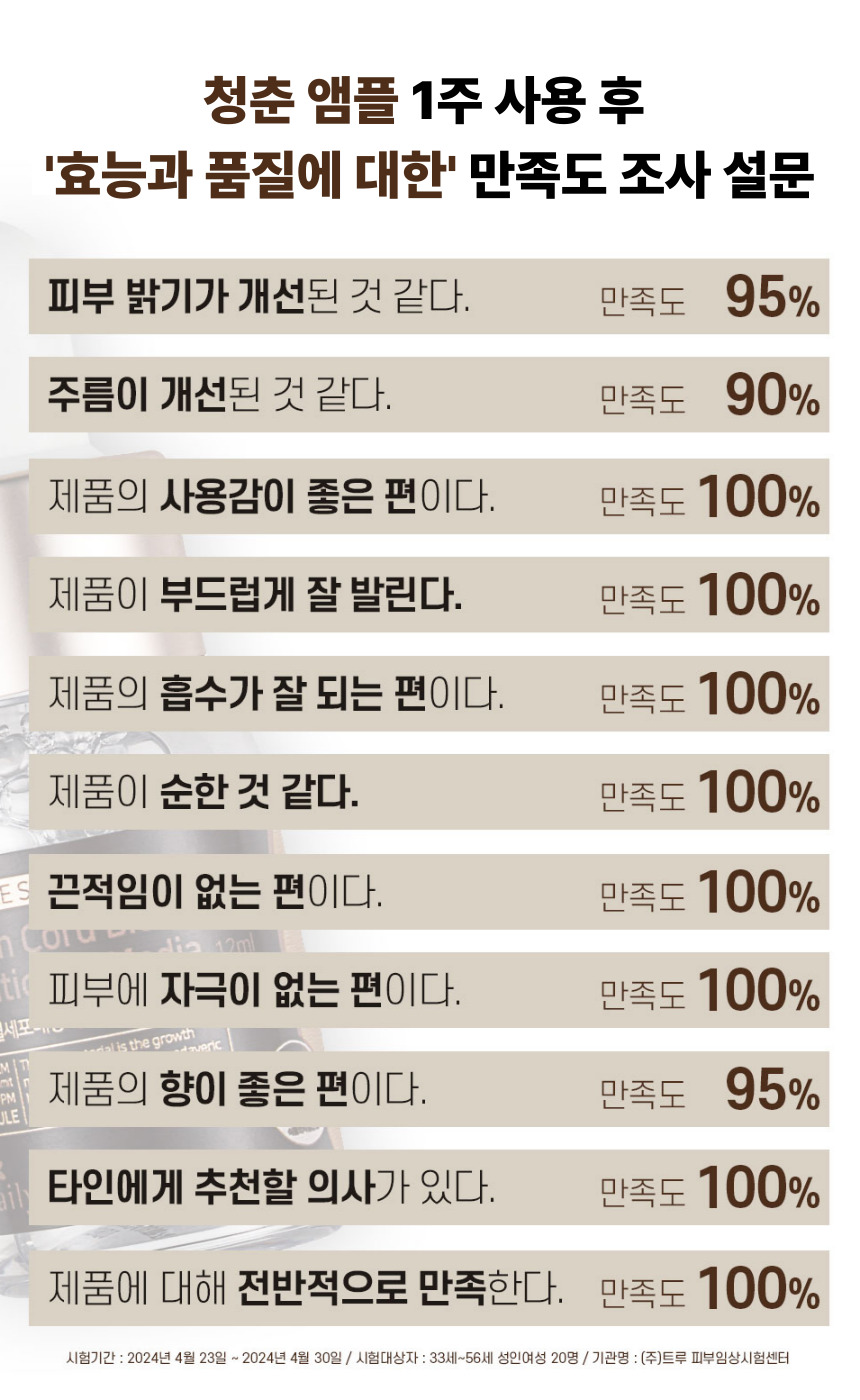 여기에 청춘 앰플의 핵심 원료인 인체제대혈세포배양액까지 더해져 복합적인 피부 고민을 균형 있게 케어할 수 있도록 설계했습니다.
