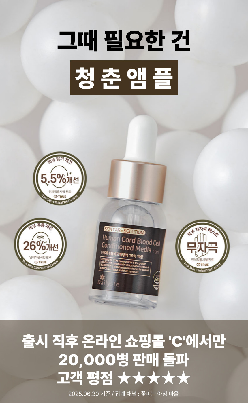 이번에 서포터 여러분께 선보이는 '청춘앰플'은 ‘인체제대혈줄기세포배양액’이라는 원료를 15% 함유한 고기능성 주름개선 화장품으로 13년간 지켜온 개발 철학과 원칙을 바탕으로 탄생했습니다.
