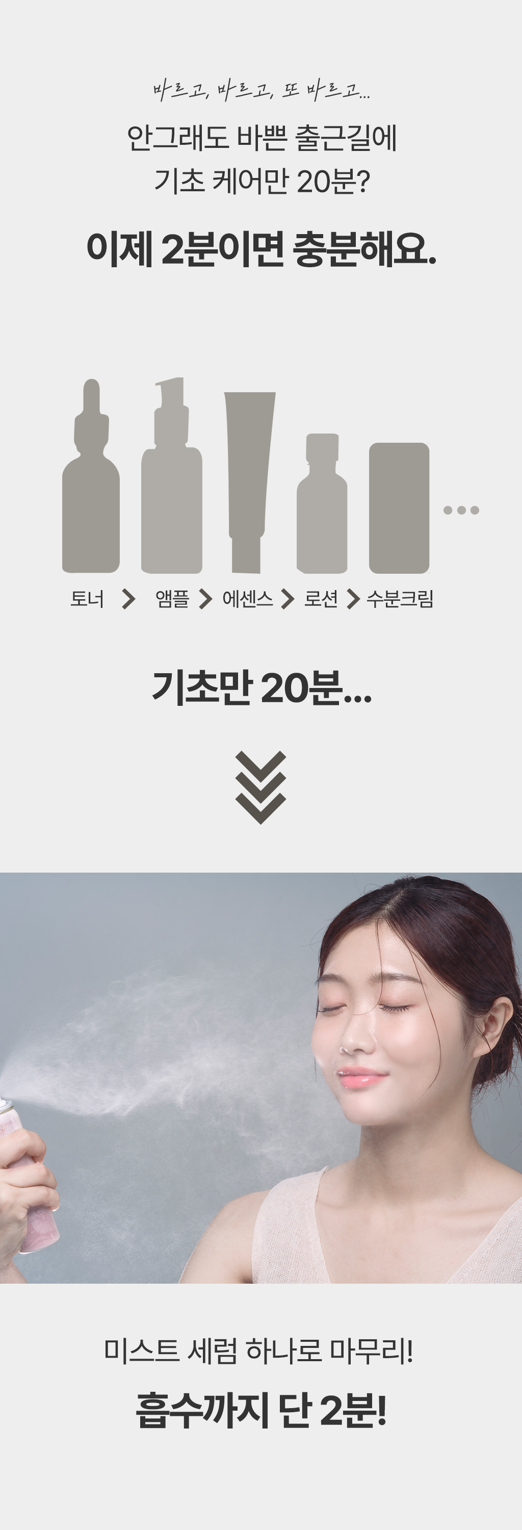 A3. 아침 루틴은 브라이트닝 미스트, 저녁 루틴은 수분 진정 미스트로 피부를 진정시키며, 세 번째 제품은 콜라겐 미스트로 세 가지 모두 하루 중 언제든 피부 탄력이 필요할 때 사용 가능합니다. 단, 브라이트닝과 콜라겐은 스킨케어 첫 단계나 메이크업 전에 뿌려주시면 더욱 효과적이고, 수분 진정은 슬리핑 팩처럼 사용하시면 더욱 효과적입니다.
