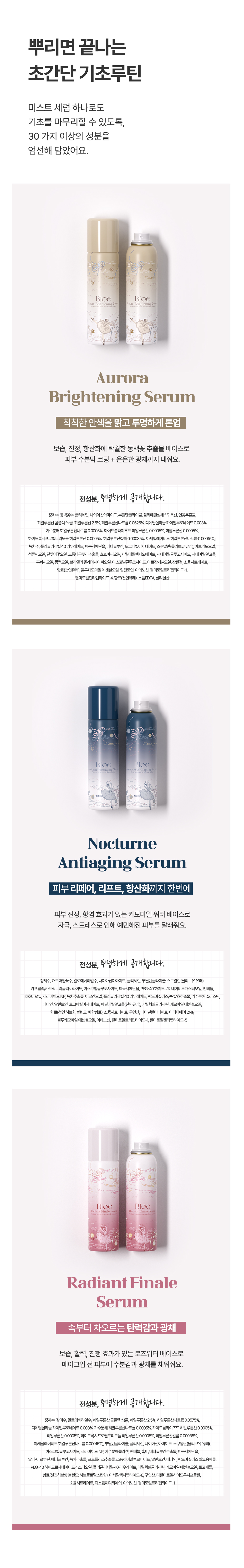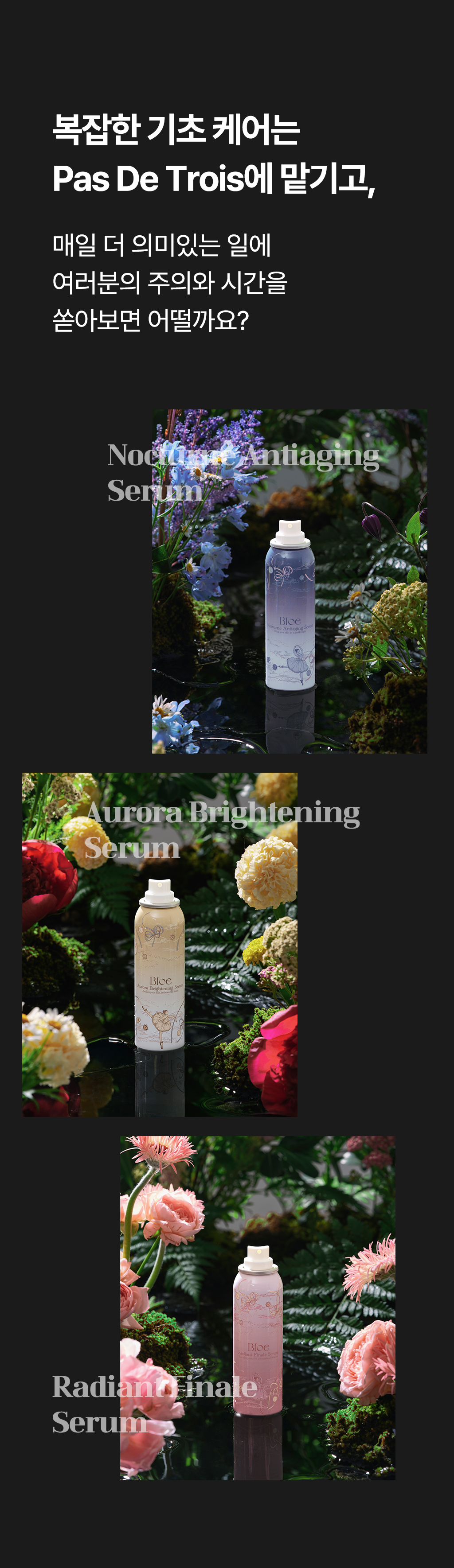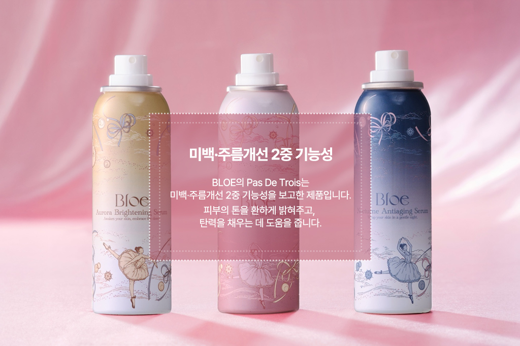 Bloe는 감성과 예술을 담은 프리미엄 뷰티 브랜드로, 피부 본연의 아름다움을 극대화하는 혁신적인 스킨케어 제품을 개발하고 있습니다. 이번 ‘Pas De Trois’ 컬렉션은 ‘세 무용수가 조화를 이루며 추는 춤’이라는 뜻으로, 발레의 우아함과 조화를 모티브로 하여 브라이트닝, 수분진정, 콜라겐 케어를 하나로 연결하여 시너지를 내는 3단계 맞춤 올인원 솔루션입니다.