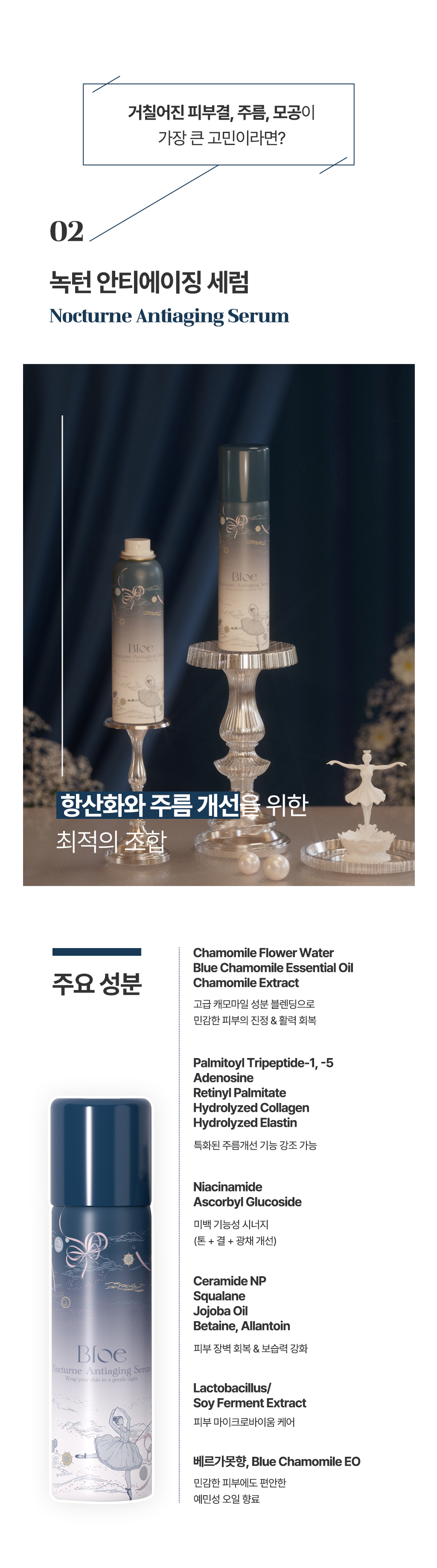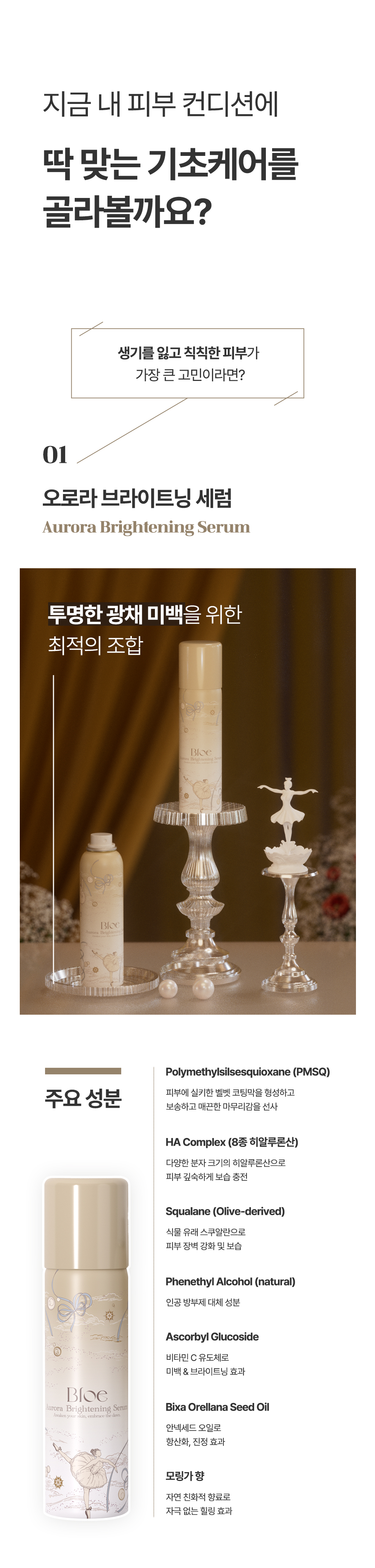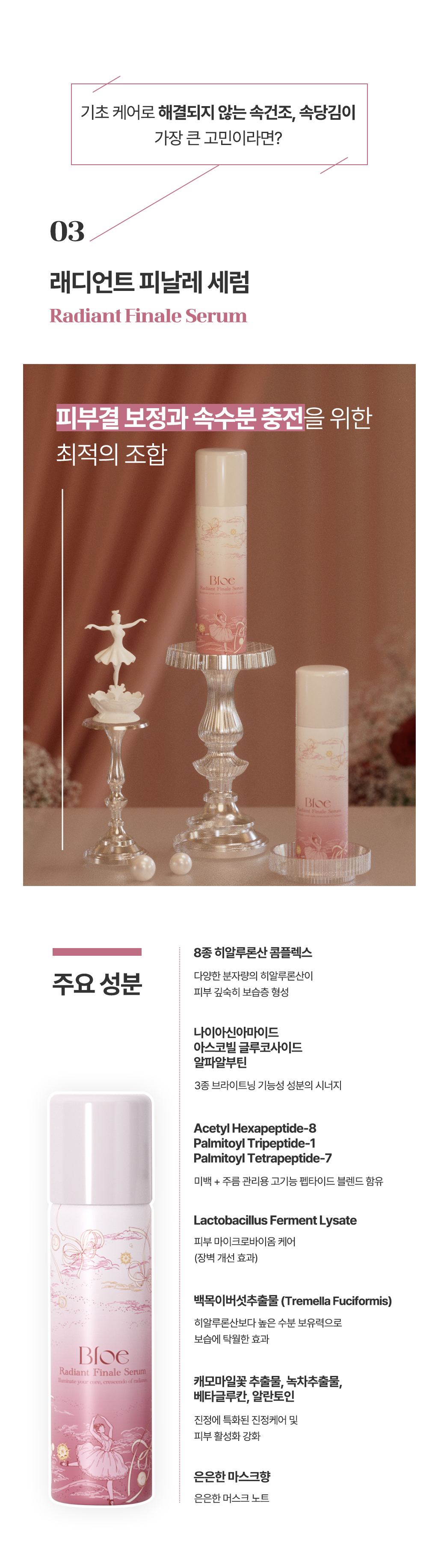 Bloe는 감성과 예술을 담은 프리미엄 뷰티 브랜드로, 피부 본연의 아름다움을 극대화하는 혁신적인 스킨케어 제품을 개발하고 있습니다. 이번 ‘Pas De Trois’ 컬렉션은 ‘세 무용수가 조화를 이루며 추는 춤’이라는 뜻으로, 발레의 우아함과 조화를 모티브로 하여 브라이트닝, 수분진정, 콜라겐 케어를 하나로 연결하여 시너지를 내는 3단계 맞춤 올인원 솔루션입니다.
