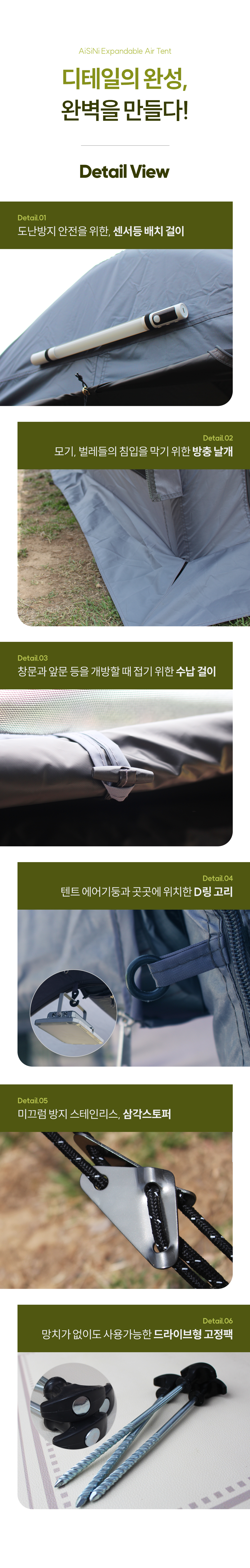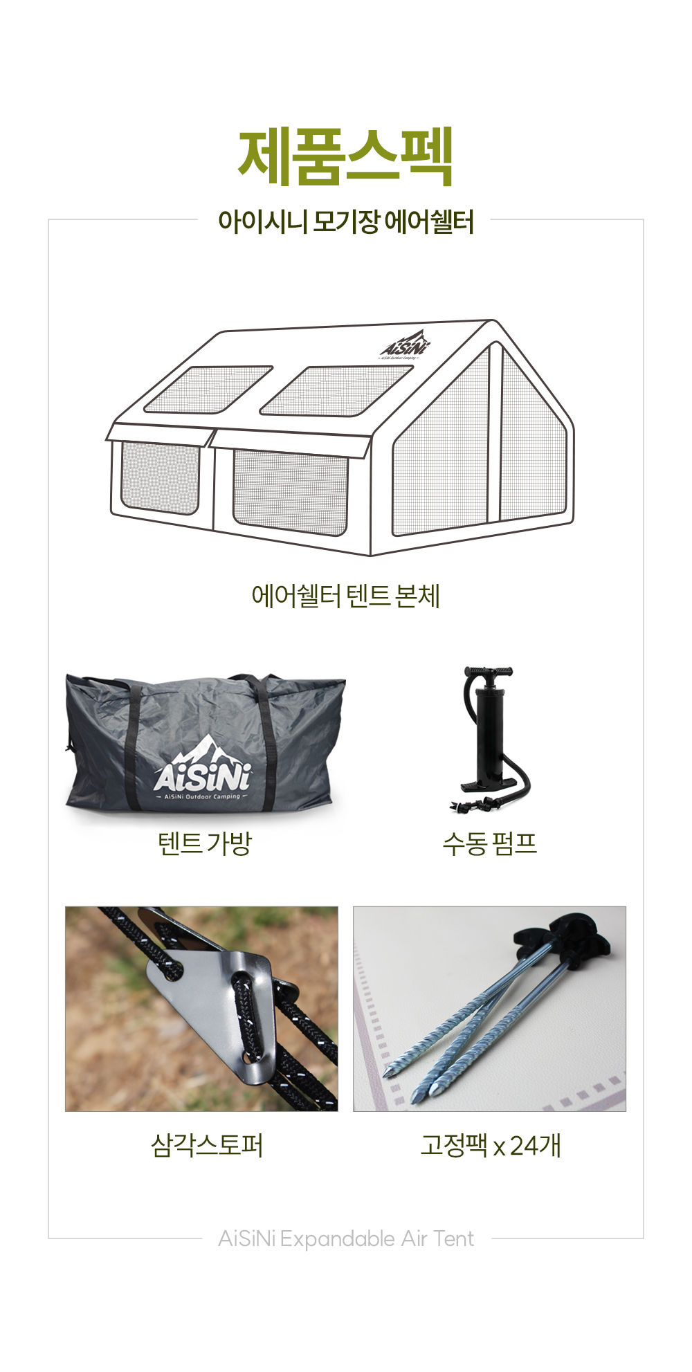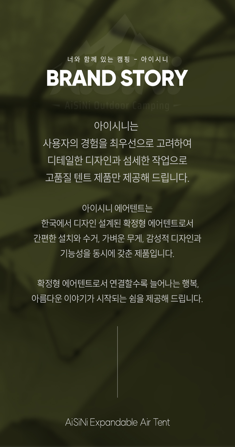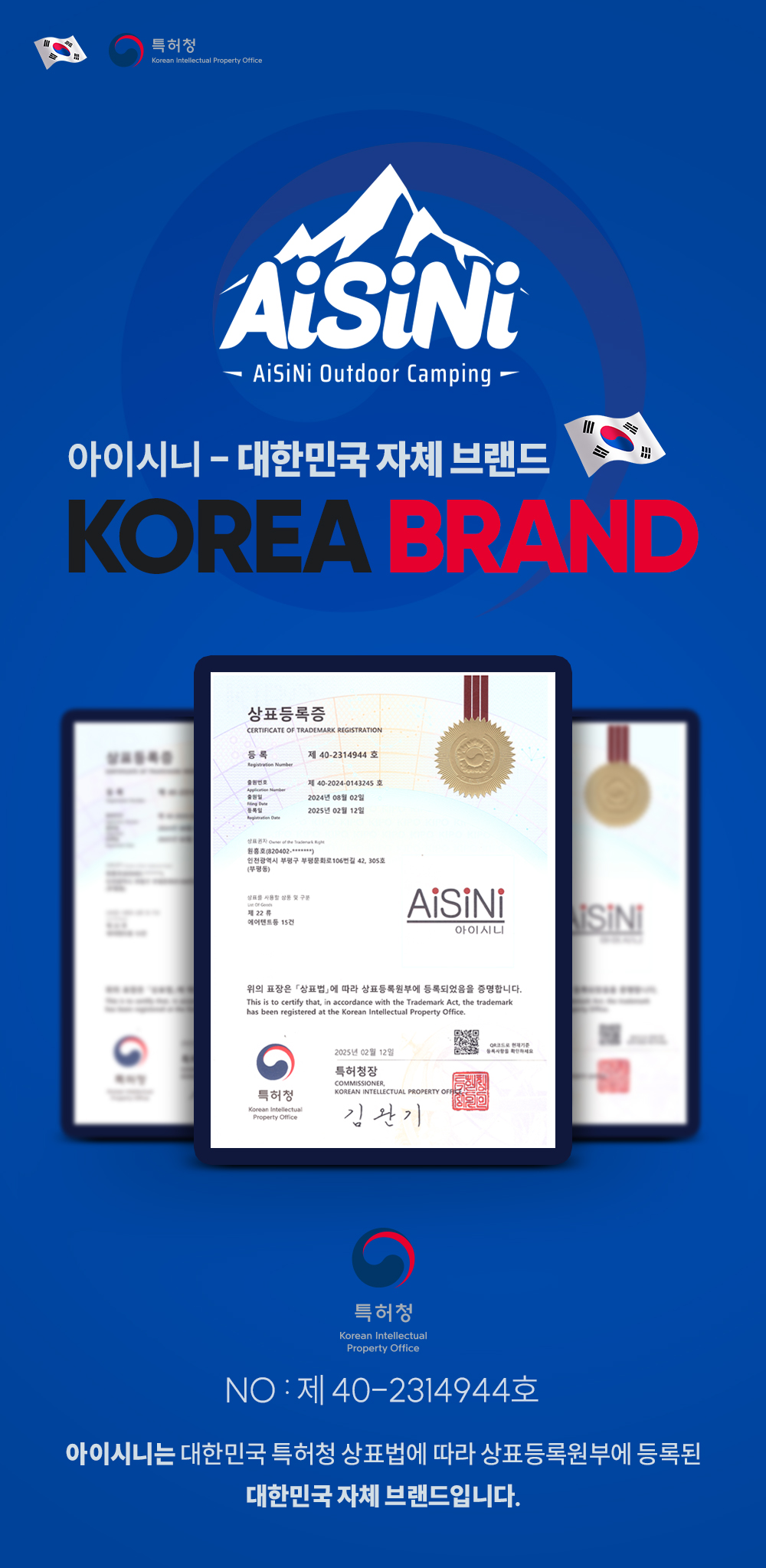 AiSiNi는 감성,실용,혁신 캠핑을 지향하는 프리미엄 캠핑용품 브랜드 입니다 .2025년 2월 12일 상표등록 완료,텐트 쉘터,에어메트,랜턴등 실사용 중심의 제품을 직접 디자인 기획,제조 판매하여 소비자에게 최고의 만족과 감동을 제공합니다 . 자연과 더 가까이,삶은 더 여유롭게,아이시니는 캠핑의 순간순간이 더욱 편안하고 특별해 질수 있도록 작지만 정직한 디테일을 하나하나 제품에 담고 있습니다.