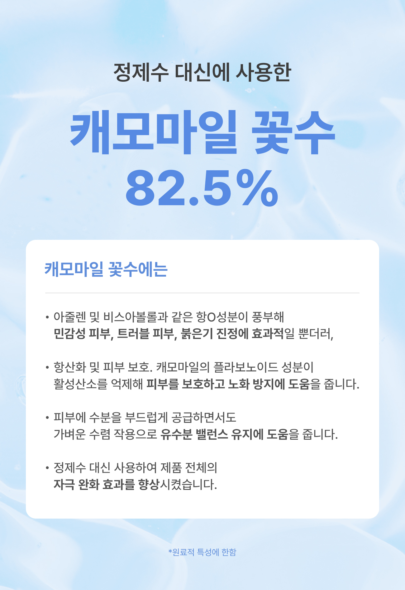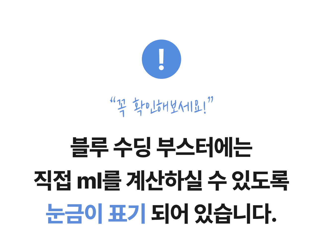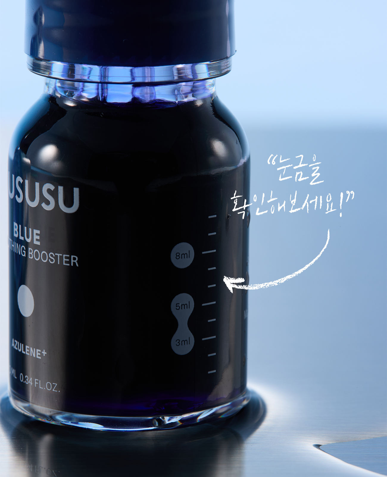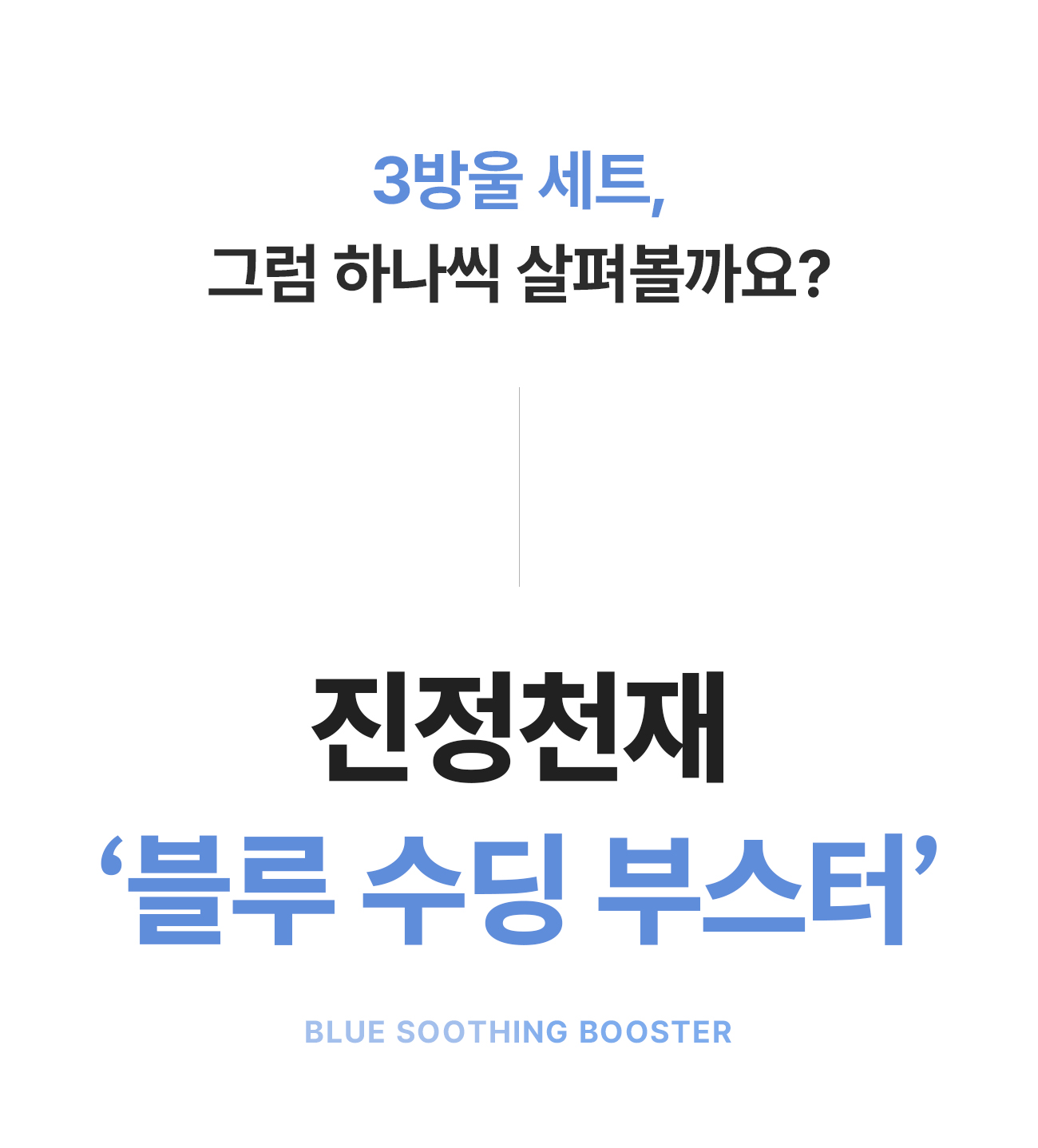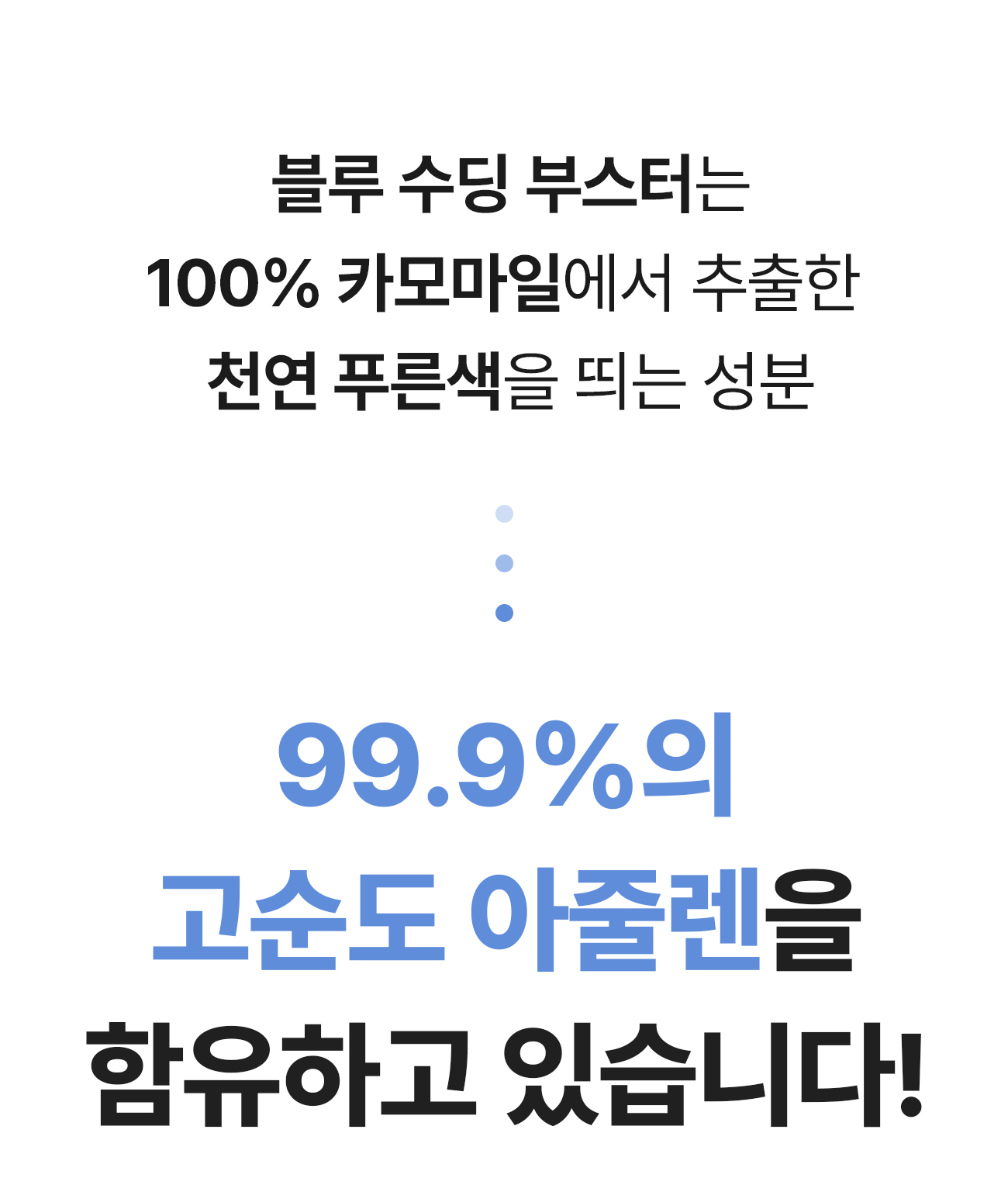 - '블루 수딩 부스터'는 카모마일에서 추출한 고농축 블루 아줄렌 성분이 들어있어서 단독 사용 시 일시적으로 푸른빛 착색이 있을 수 있으나 사용 후 시간이 지나면 사라집니다. 집중 진정을 위해 단독으로 추가 도포 시 밤에 사용을 권장 드립니다.