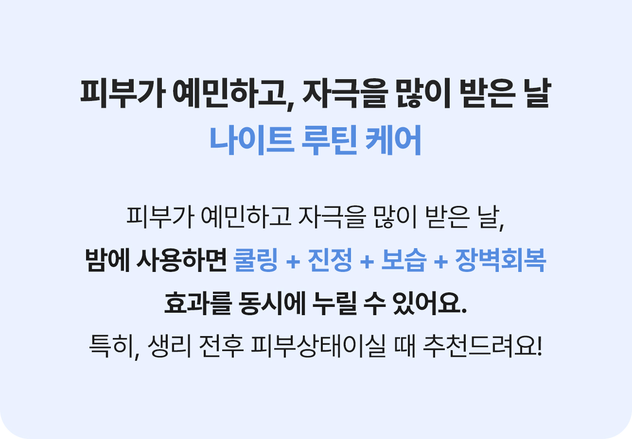 - 피부 장벽이 약해졌을 때 생기는 염증 반응을 억제해 민감 피부에 적합합니다