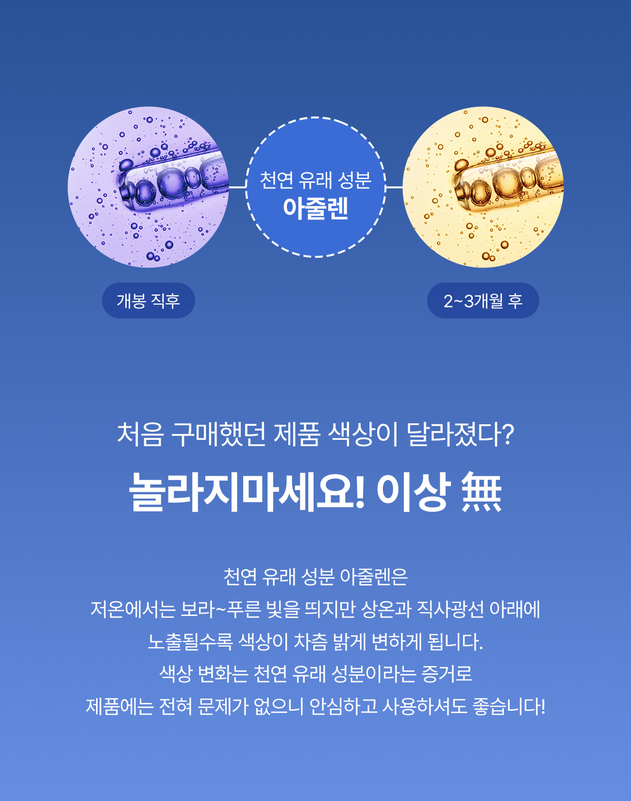 - 천연 유래 성분인 아줄렌은 예쁜 푸른빛을 띠지만 빛과 열에 노출될수록 차츰 색상이 변할 수 있습니다. 색상이 변하는 것은 천연 유래 성분의 자연스러운 현상으로 제품에는 전혀 문제가 없으니 안심하고 사용해 주세요. (뜨거운 열이 나 직사광선을 피해 저온의 화장품 냉장고나 화장품 박스 안에 보관해 주시면 천연 아줄렌의 푸른색을 오래 유지하며 사용 가능합니다.)