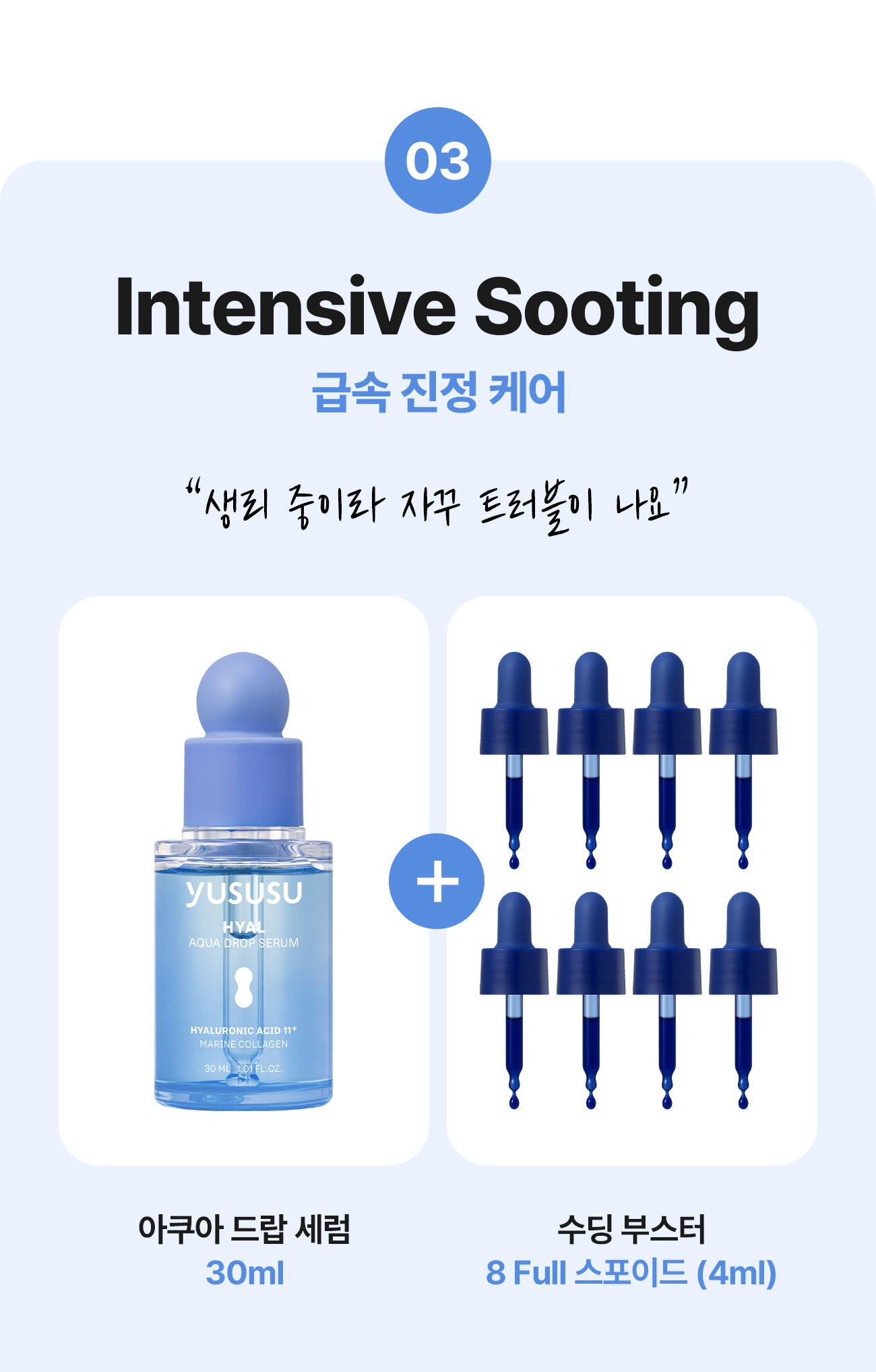 A. 물론입니다! 단, 유수수는 세럼 단계에서 ‘단독 사용만으로도 진정 + 보습 루틴이 완성’되는 구조이기 때문에, 너무 많은 제품을 레이어링하지 않으셔도 됩니다. 또한, 남은 블루 수딩 부스터는 사용하고 계신 크림, 마스크 또는 패드에 섞어서 사용도 가능합니다. (트러블 진정 기능을 강화할 수 있습니다.)