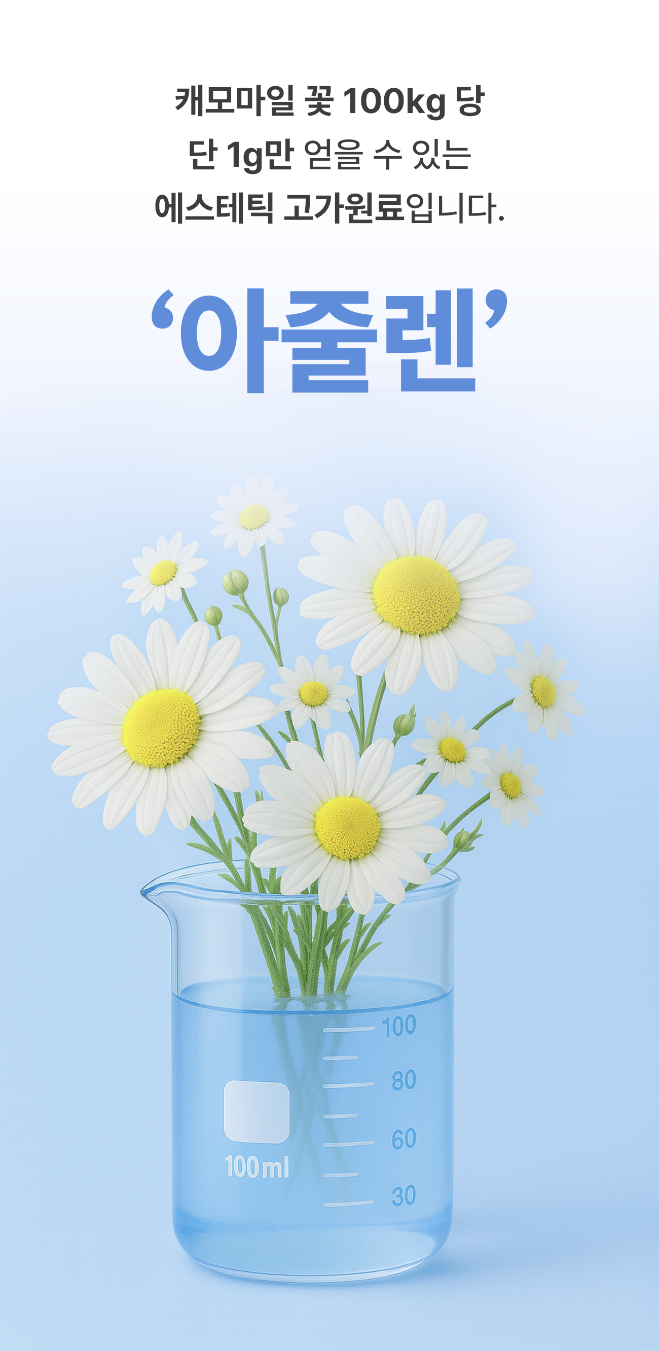 피부과 및 청담 에스테틱샵에서 트러블 피부 대상 또는 시술 후 자극받은 사람들 대상 처방하는 성분이 바로 이 천연 캐모마일에서 추출한 고순도 구아이아줄렌입니다.