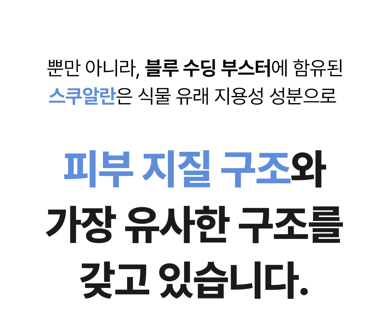 블루 수딩 부스터는 구아이아줄렌을 수용성으로 안정화한 성분인 소듐구아이아줄렌설포네이트 성분을 활용하여 오일 성분에 민감한 피부에도 부드럽게 작용할 수 있게 개선하였습니다.