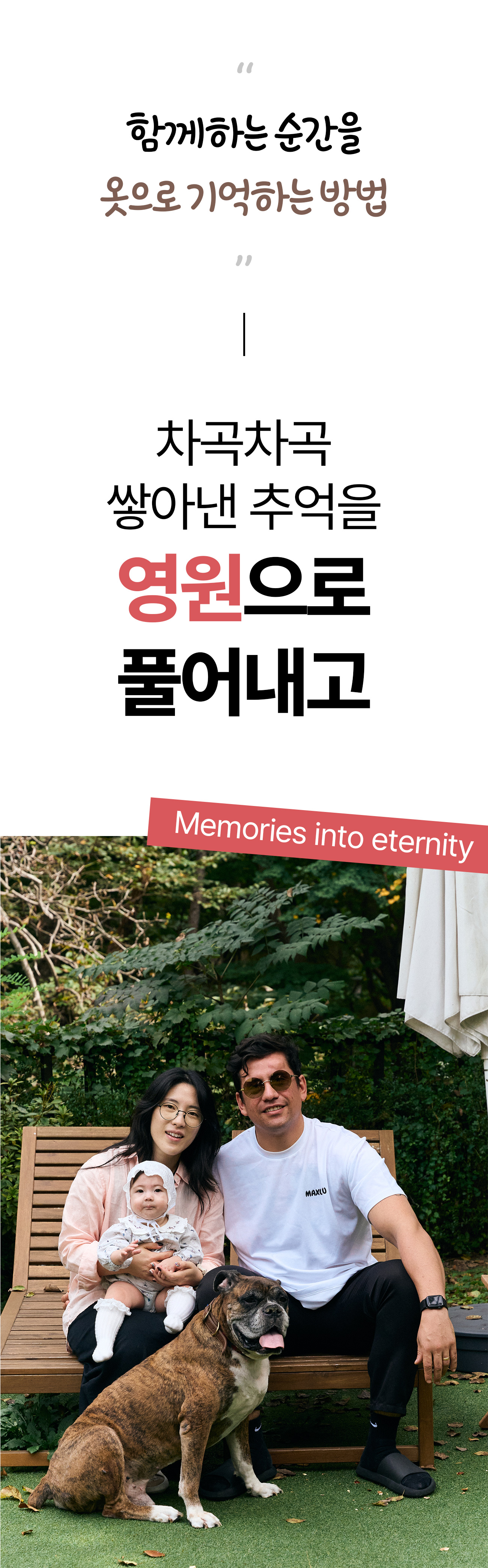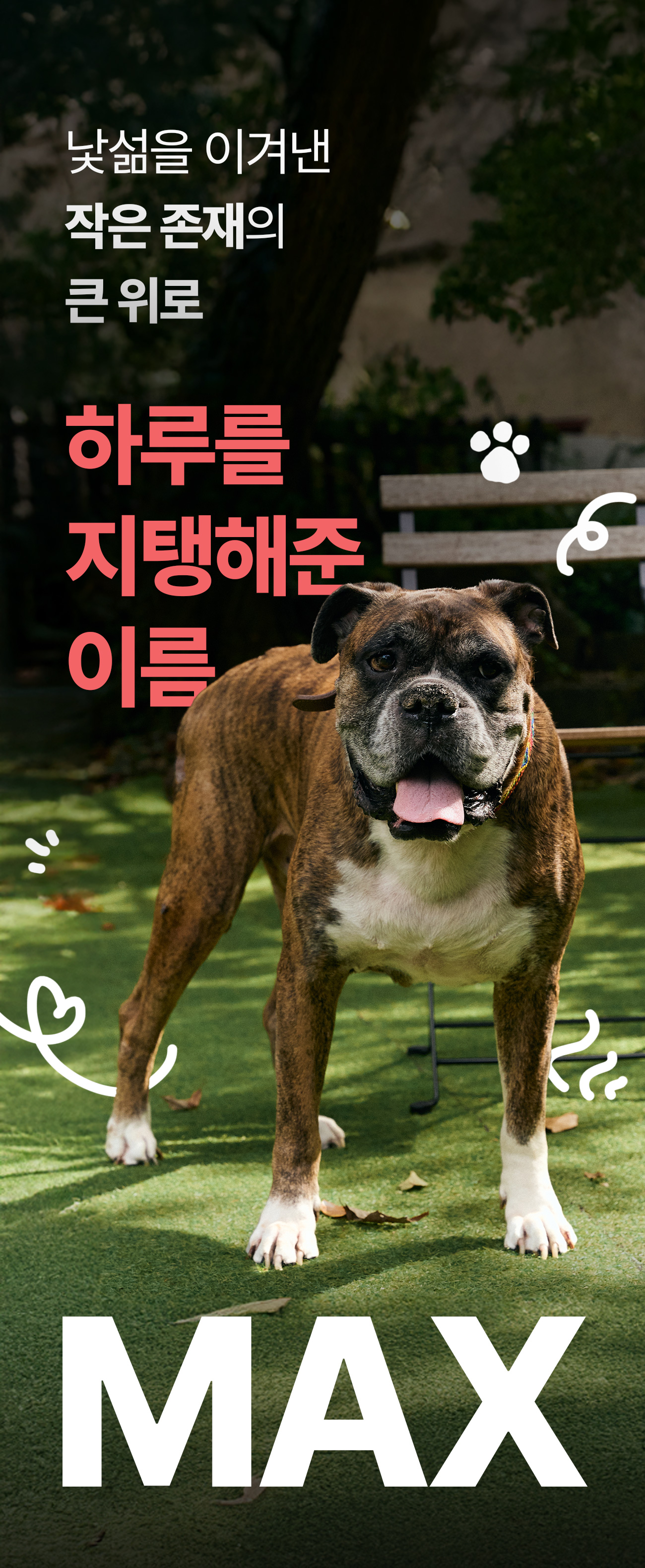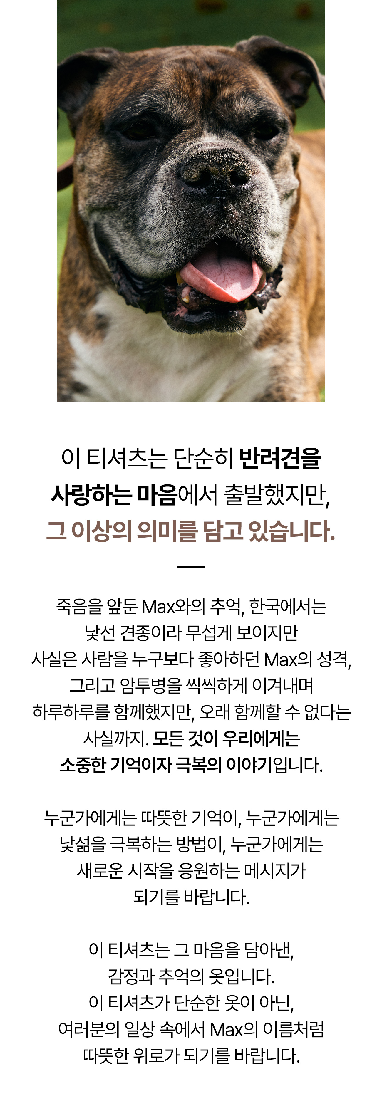 모든 반려인과 반려견들에게는 저마다의 특별한 사연이 있겠죠?저 또한 특별하고 소중한 저의 반려견을 기억하고자, 일상에 스며들어 언제나 함께할 수 있는 무언가를 만들고 싶었습니다.일상에 스며들기위해선 손에 자주 가야하고 늘 내 몸 어딘가에 있어야 한다고 생각해서 그 첫 시작을 누구나 즐겨입는 티셔츠를 제작하게 되었어요. 복서라는 종의 강아지 특징을 살린 아주 귀여운 디자인을 넣어서 말이죠.
