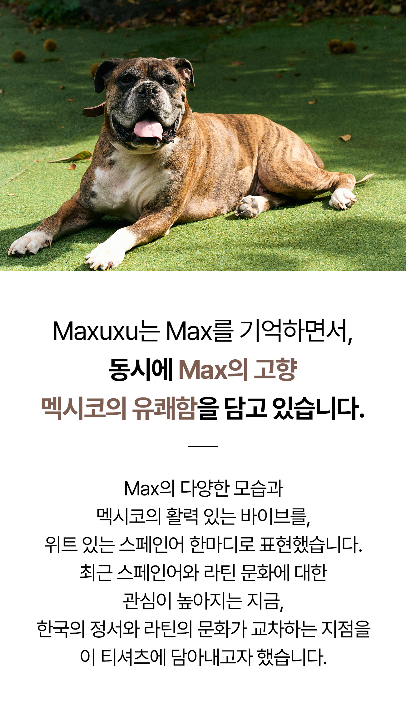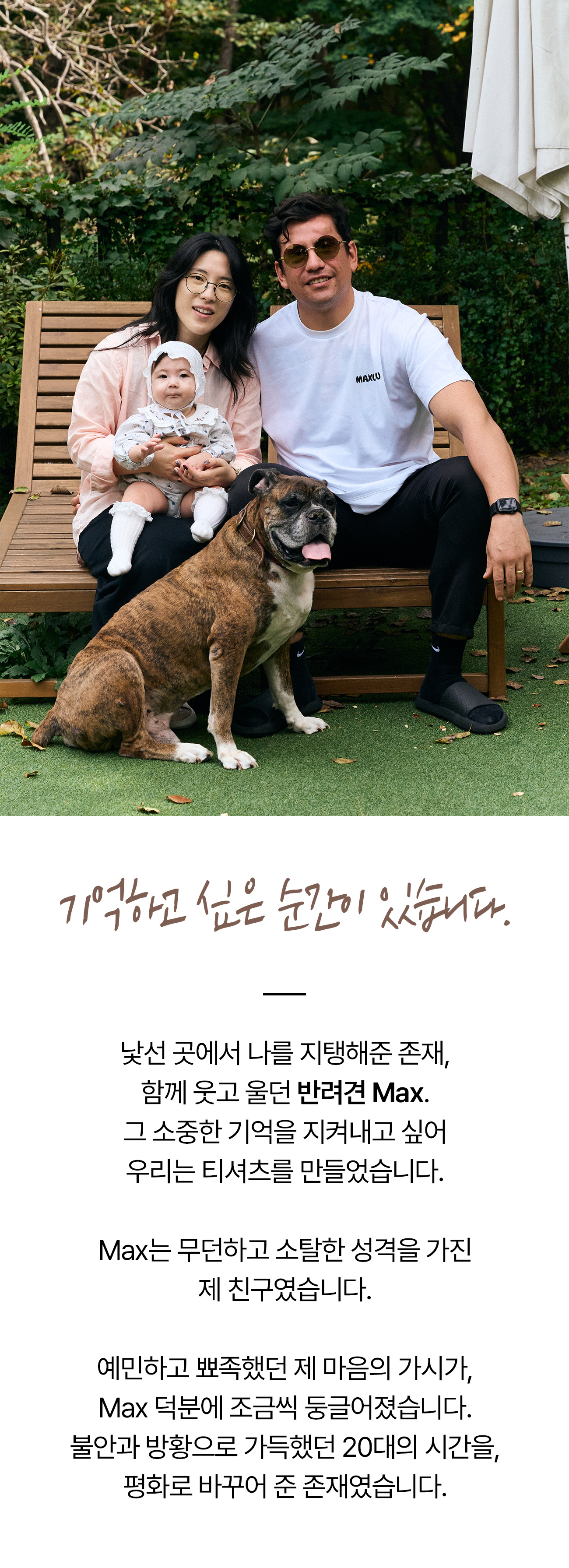 특별한 반려견을 기억하기 위해 MAXUXU 티셔츠를 제작하게 된 루에세라입니다.요즘은 반려견 없이 사는 사람들보다 반려견과 함께 더불어 사는 사람들이 더 많은 것 같아요.