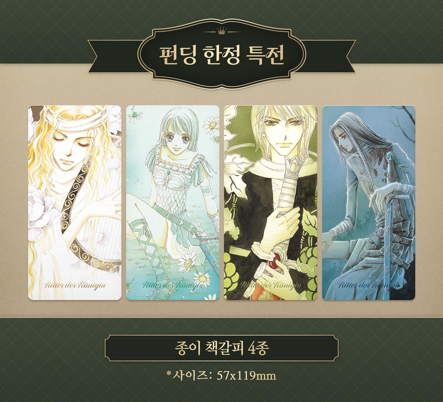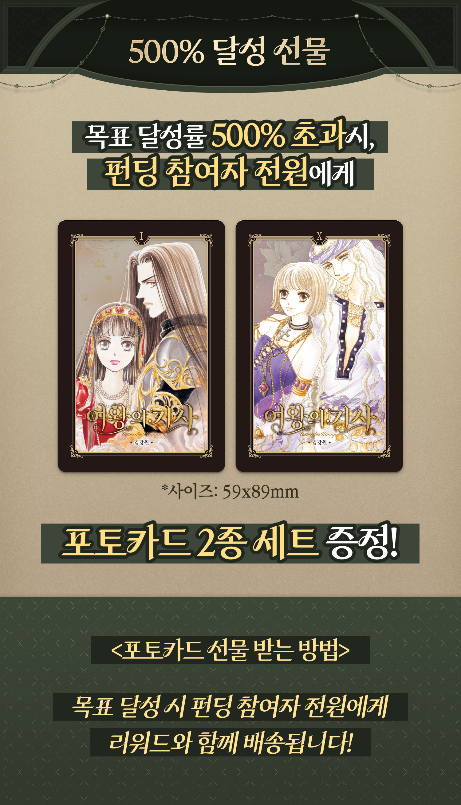 <여왕의 기사>를 사랑해주시는 독자 여러분의 응원에 힘입어 펀딩이 500%를 달성하면, 참여해주신 모든 분들께 한정 포토카드 2종 세트를 선물로 드립니다.