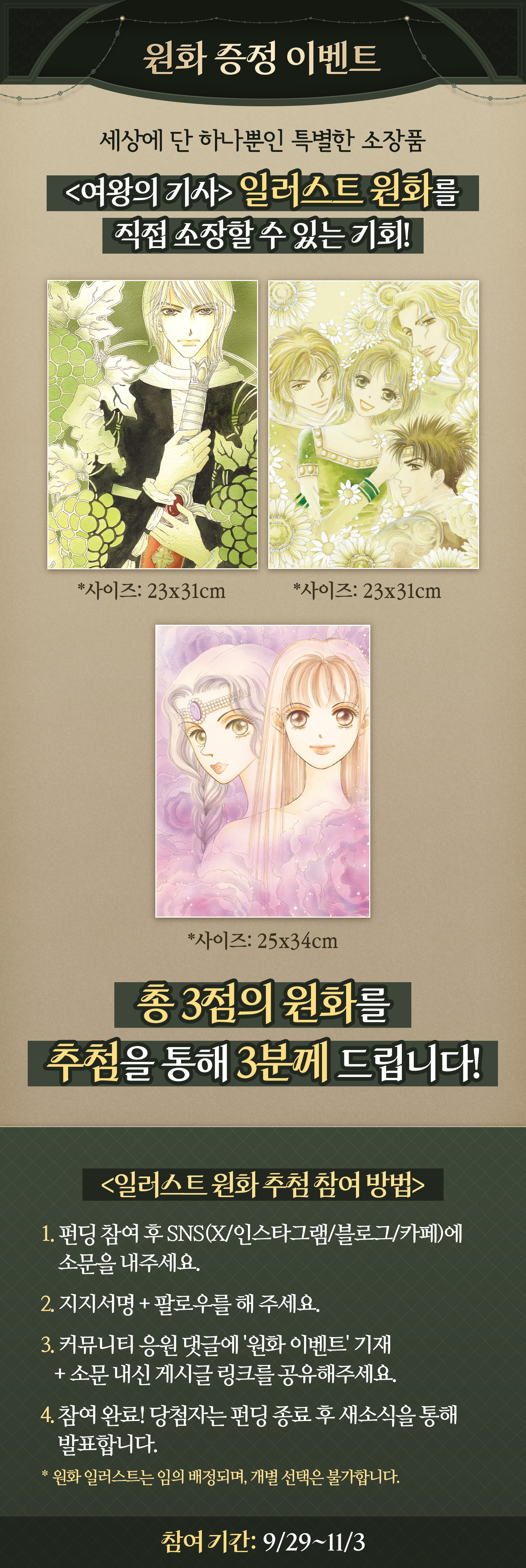 펀딩 소식과 함께 작품에 대한 추억과 기대감 등 정성스레 작성해주실 수록 당첨 확률도 올라갑니다!