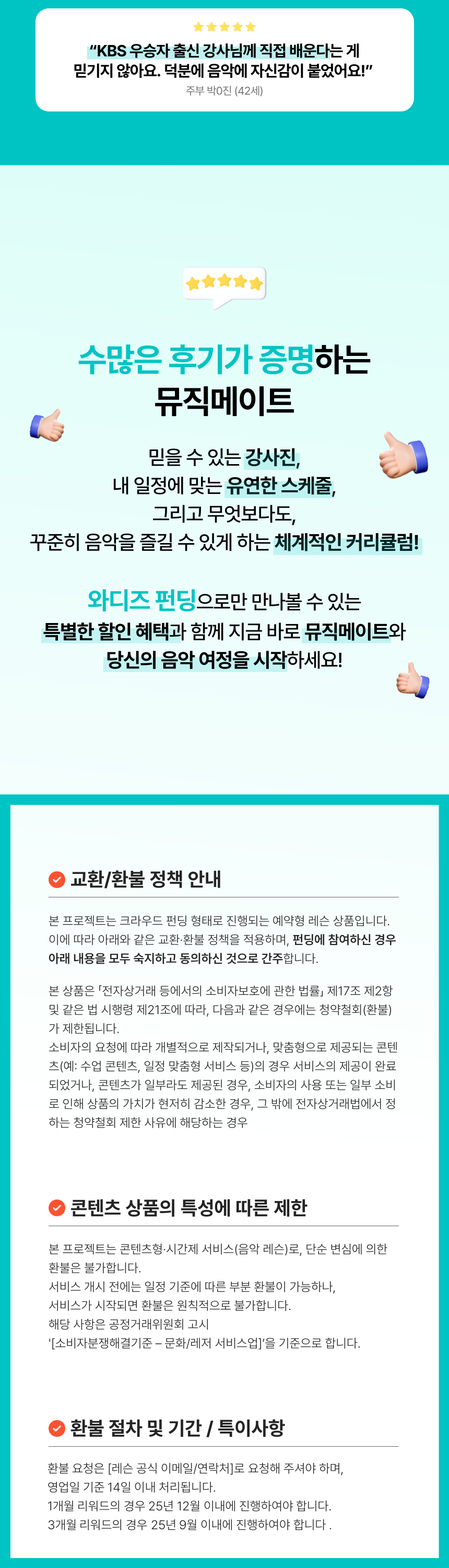 와디즈는 단순한 플랫폼이 아닌,가치에 공감하는 사람들이 함께 모여 응원하고 연결되는 공간이기에, 실력과 인성을 겸비한 아티스트들을 더 많은 분께 소개하고,악기라는 멋진 취미의 진입장벽을 낮출 수 있다고 믿었습니다.