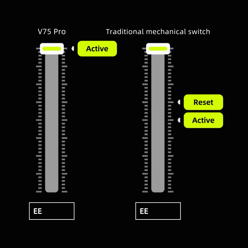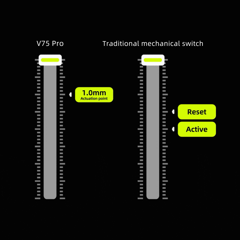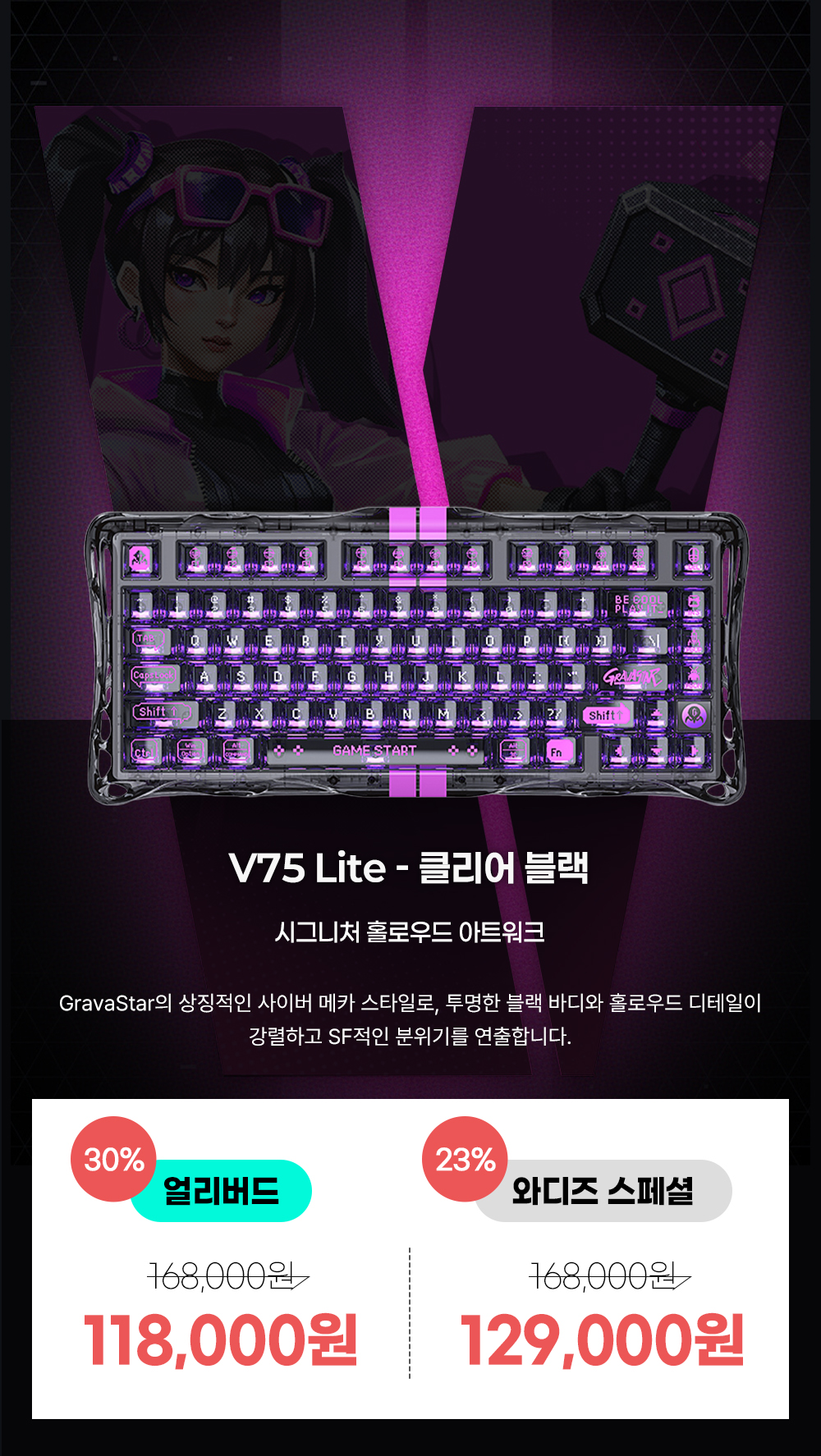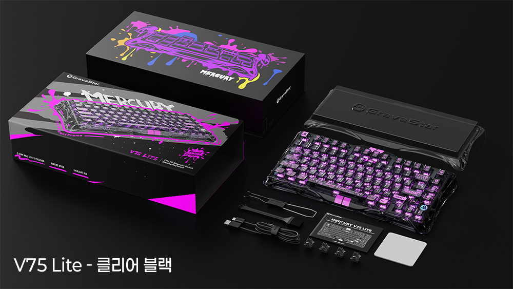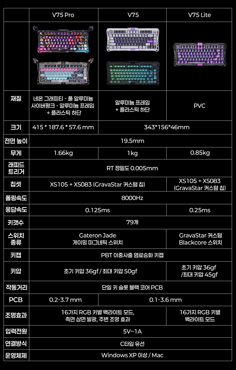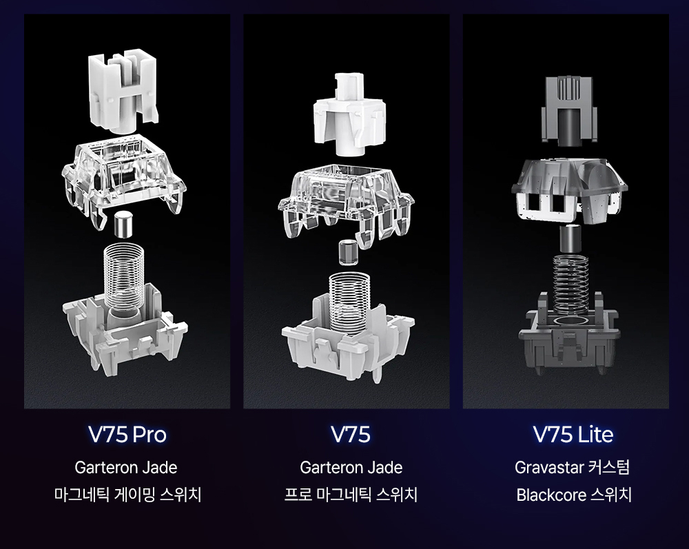 V75 Pro, V75 키보드는 Garteron Jade 게이밍 마그네틱 스위치, V75 Lite 키보드는 GravaStar 커스텀 Blackcore 스위치를 사용했습니다.