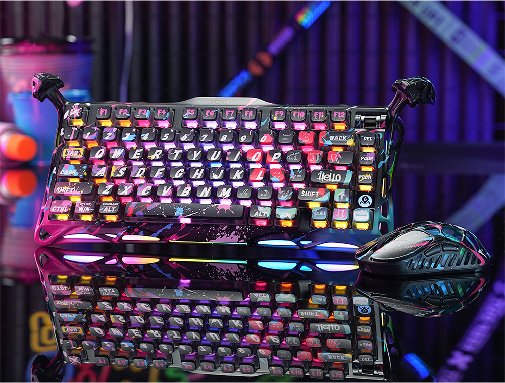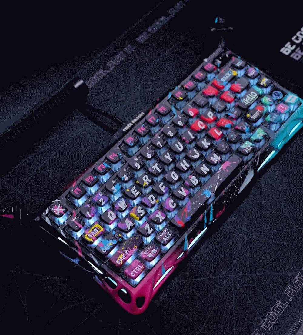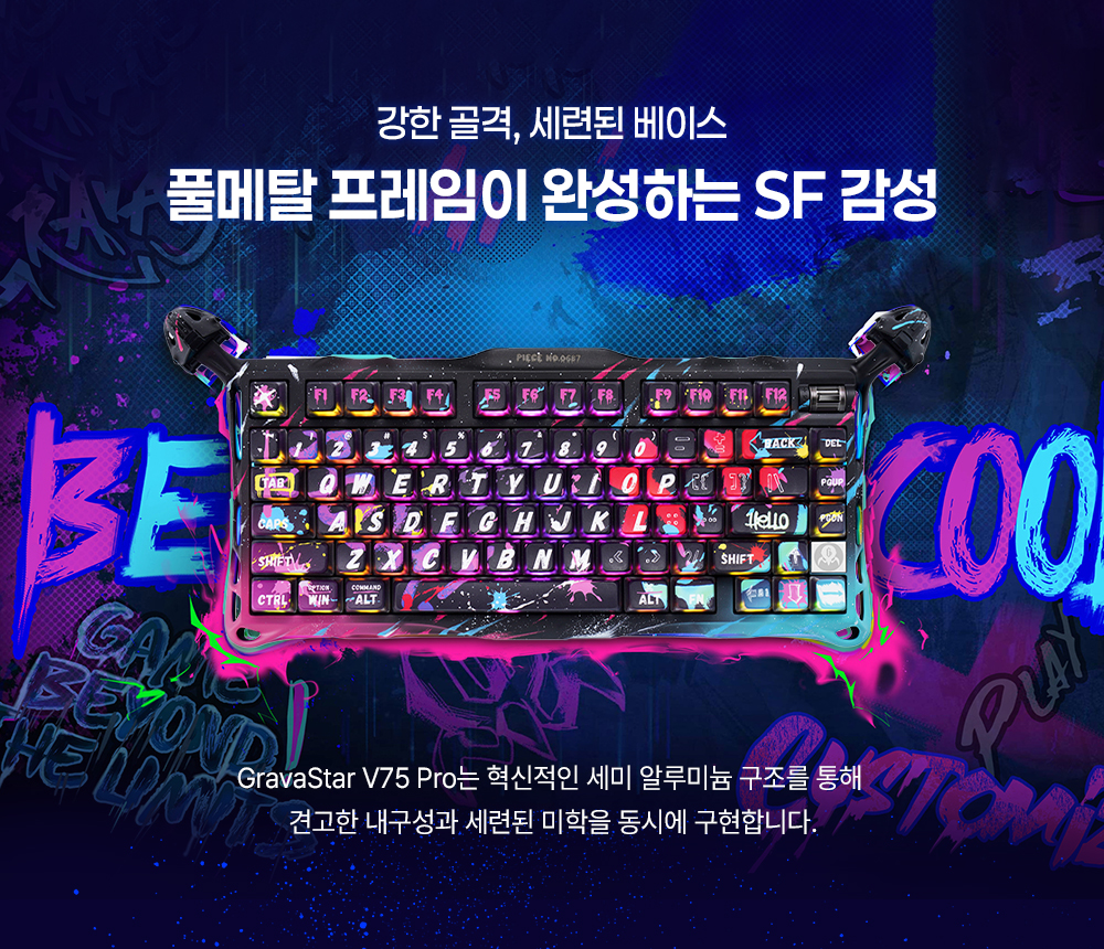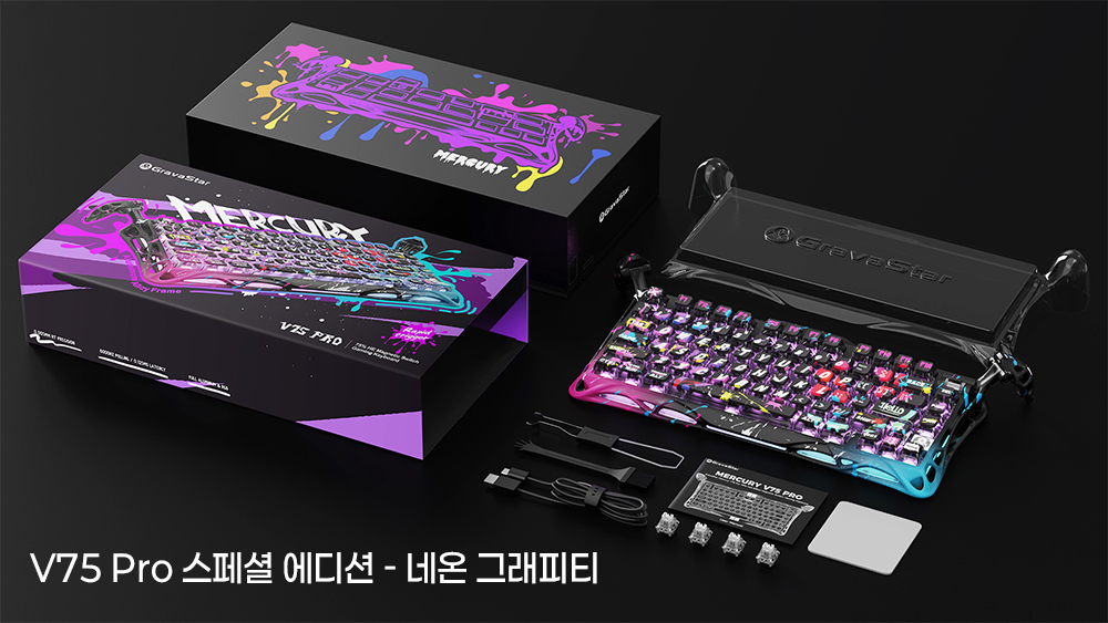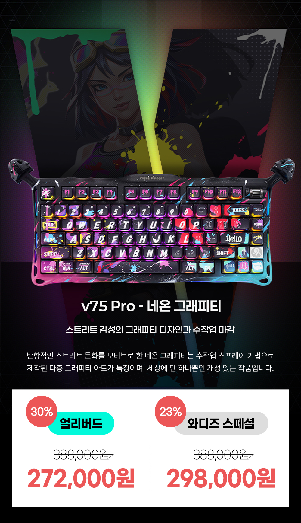 자유분방한 스트리트 문화를 모티브로 디자인한 V75 Pro 네온그래피티는 수작업 스프레이 기법으로 제작된 다층 그래피티 아트가 특징이며, 모든 키보드는 세상에 단 하나뿐인 개성 있는 작품입니다.
