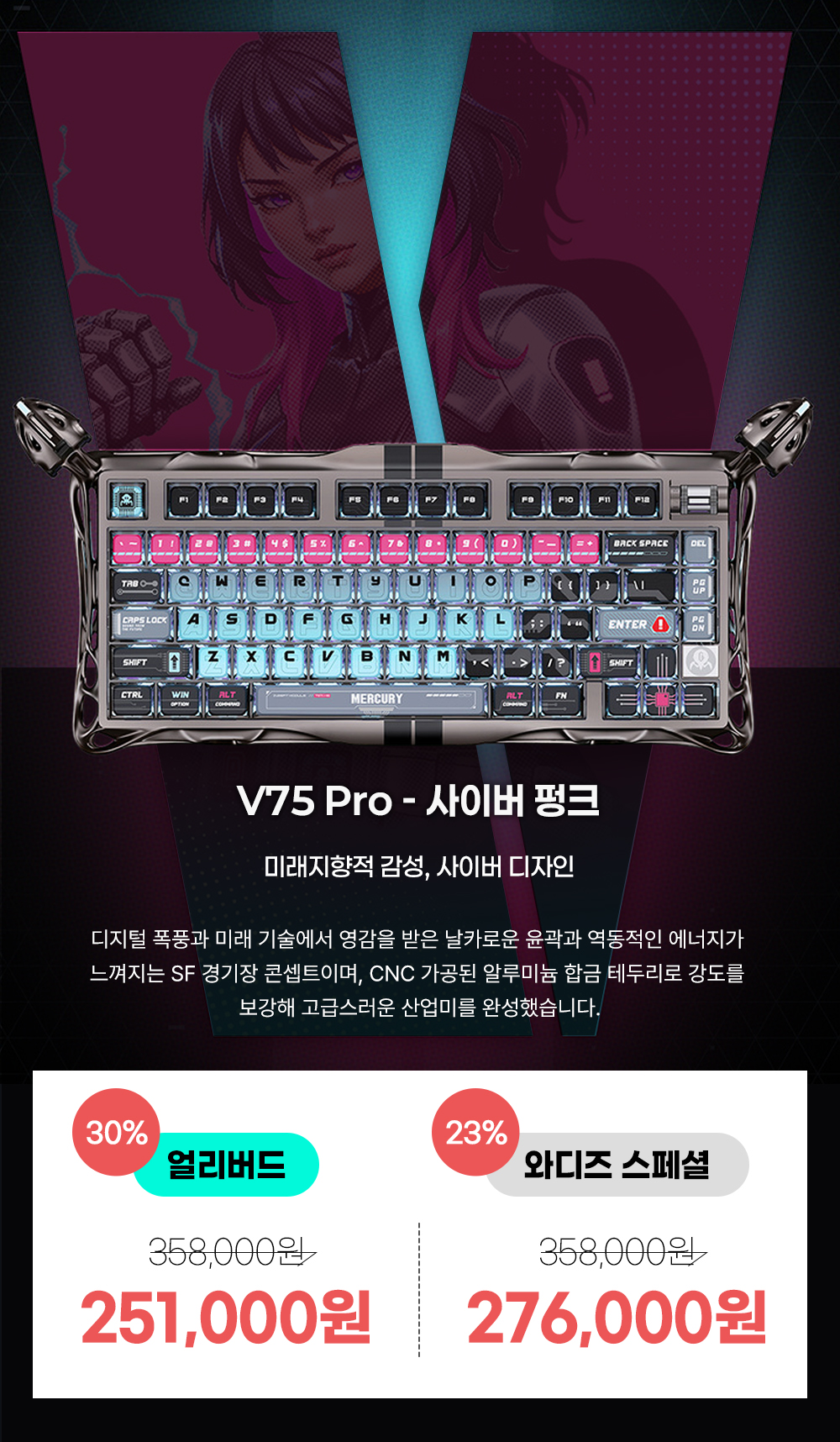 국내에서 오직 와디즈에서 처음으로 '머큐리 V75 홀 이펙트 게이밍 키보드'를 만나볼 수 있어요.