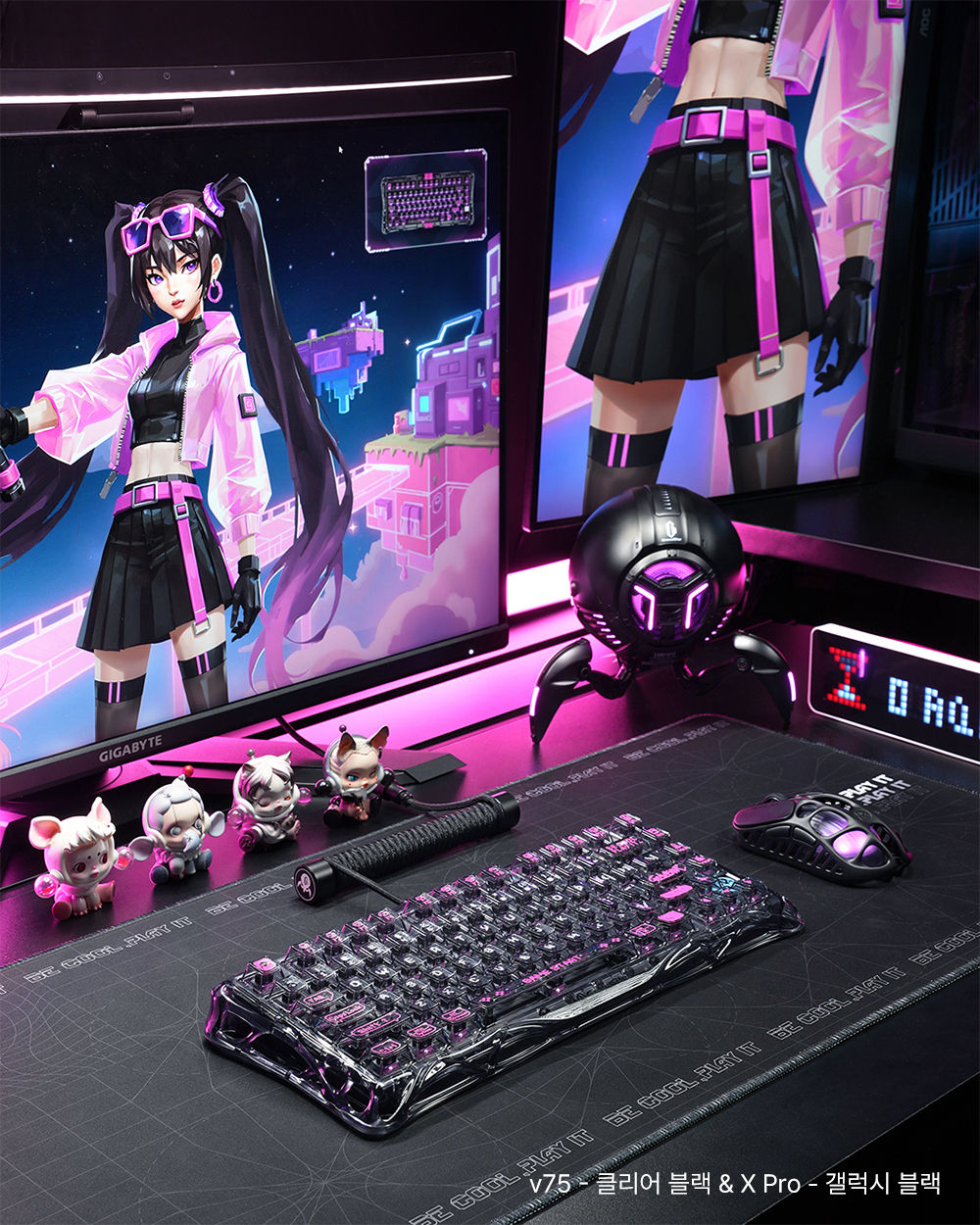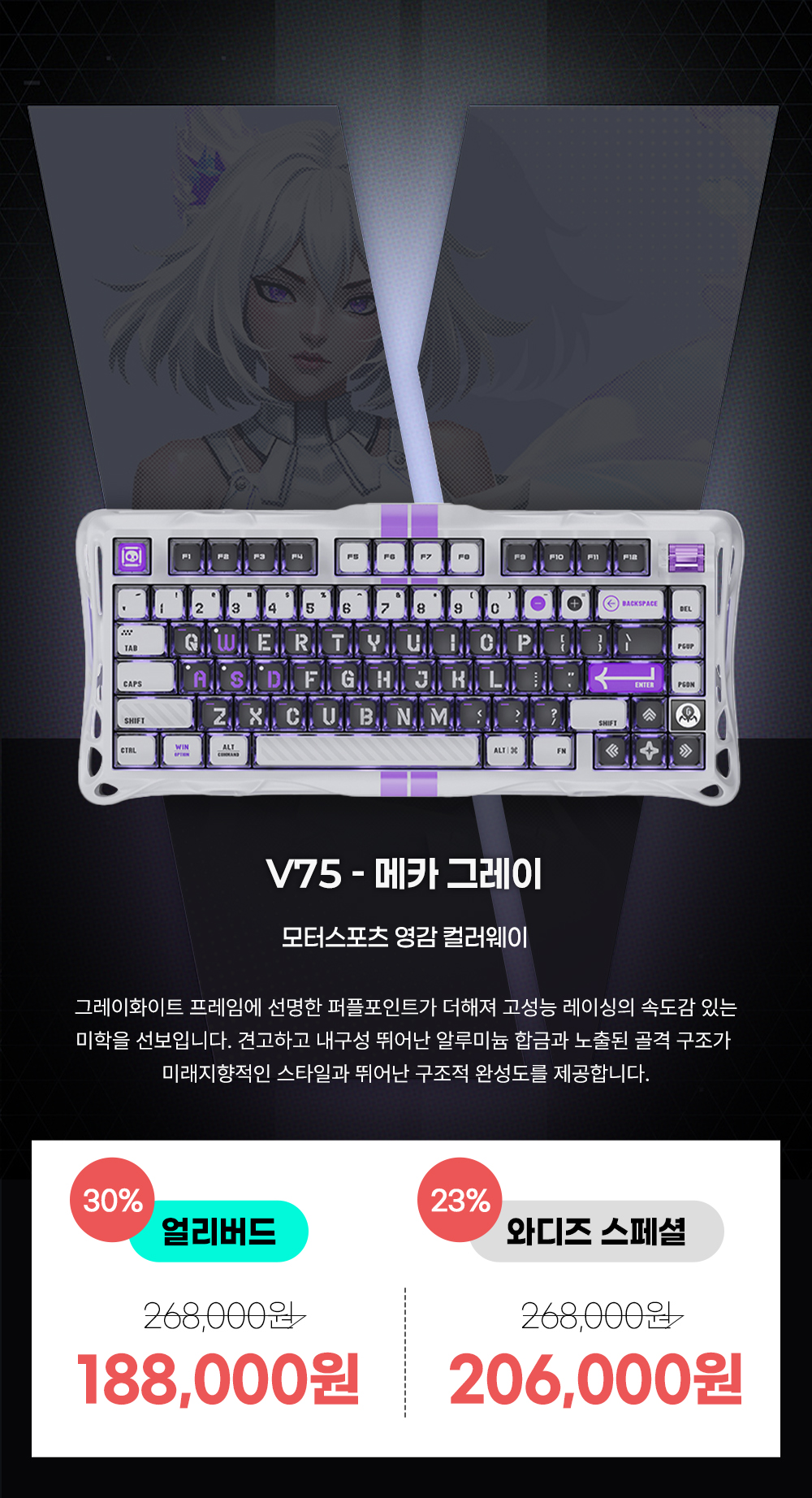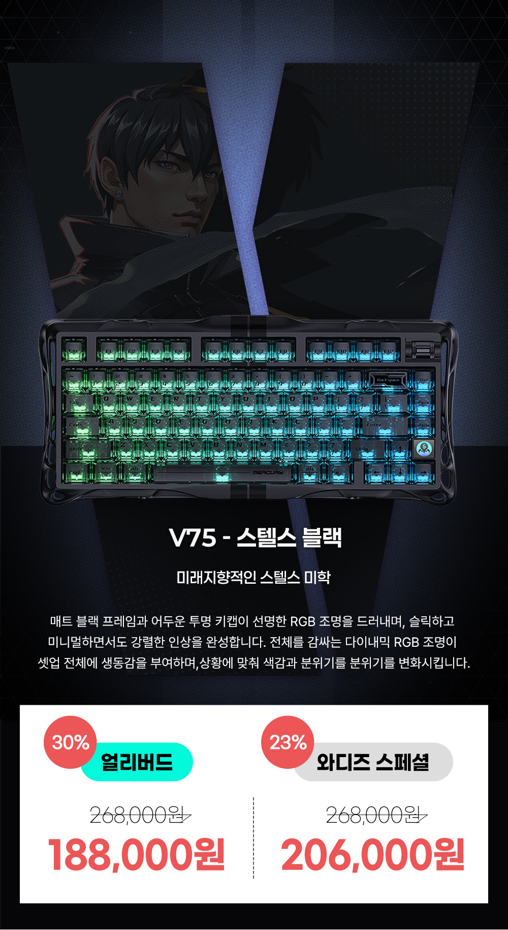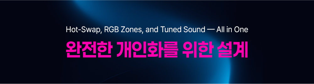 V75 시리즈의 모든 키보드는 RGB 백라이트 시스템은 16가지 역동적인 모드와듀얼 존 컨트롤을 제공하여, 키보드 키와 측면 앰비언트 조명이 완벽하게 연동되어 몰입감 넘치는 비주얼을 연출합니다.