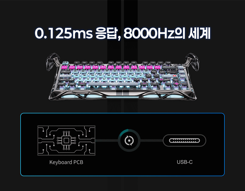 V75 Pro는 초고속 8000Hz USB 폴링 레이트와 256kHz 키 위치 스캐닝을 결합해,진정한 8kHz 폴링 환경을 구현합니다. 이를 통해 키보드 지연 시간을 극한까지 줄여,거의 즉각적인 0.125ms의 응답 속도를 제공합니다.