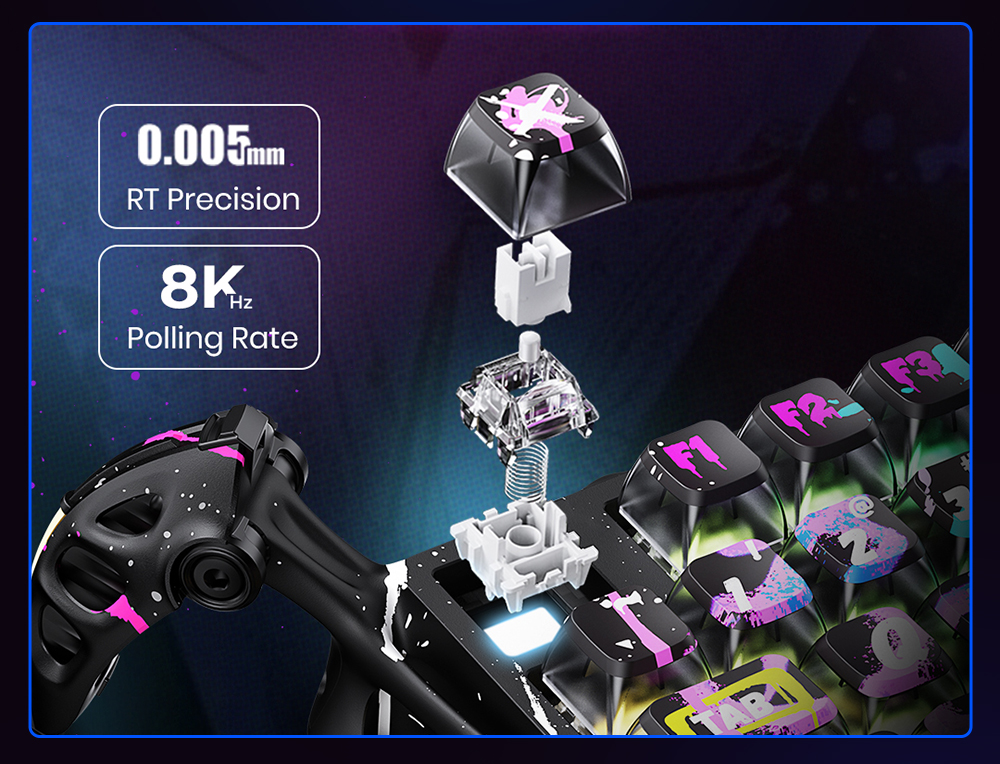 업계 최고 수준인 0.005mm 정밀도와 0.2mm ~ 3.7mm까지 조절 가능한 작동 깊이로 설계되어 있어, 입력 지연을 없애고 완벽한 제어를 제공합니다. CS2의 결정적 한타, 발로란트의 정밀 조준, 예리함을 유지해야하는 셋업 구성까지 언제든 완벽하게 대응할 수 있도록 도와줍니다.