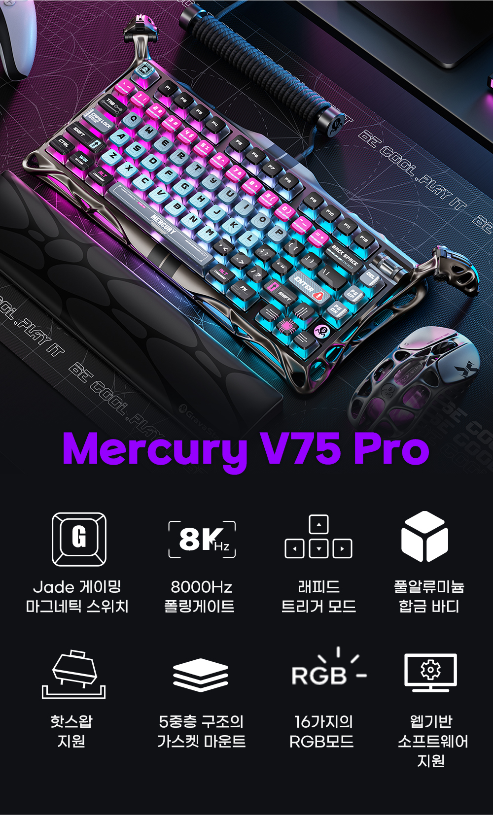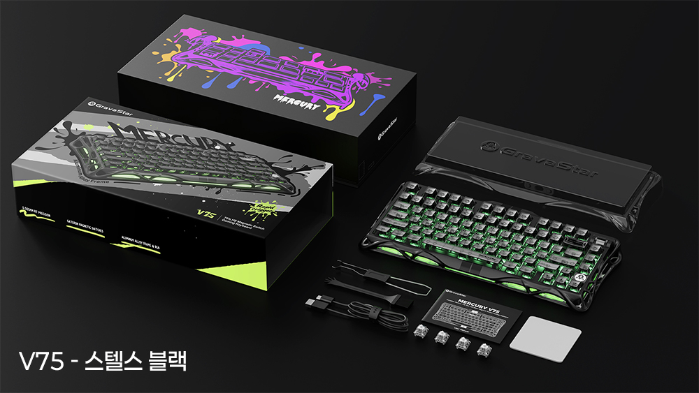 Mercury V75 Pro는 GravaStar의 첫 번째 마그네틱 스위치 키보드로, 최첨단 자석 기술, 가스켓 구조의 타건감, RGB 감성을 통해 75% 배열의 기준을 새롭게 정의합니다.