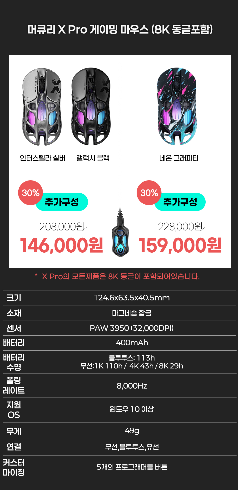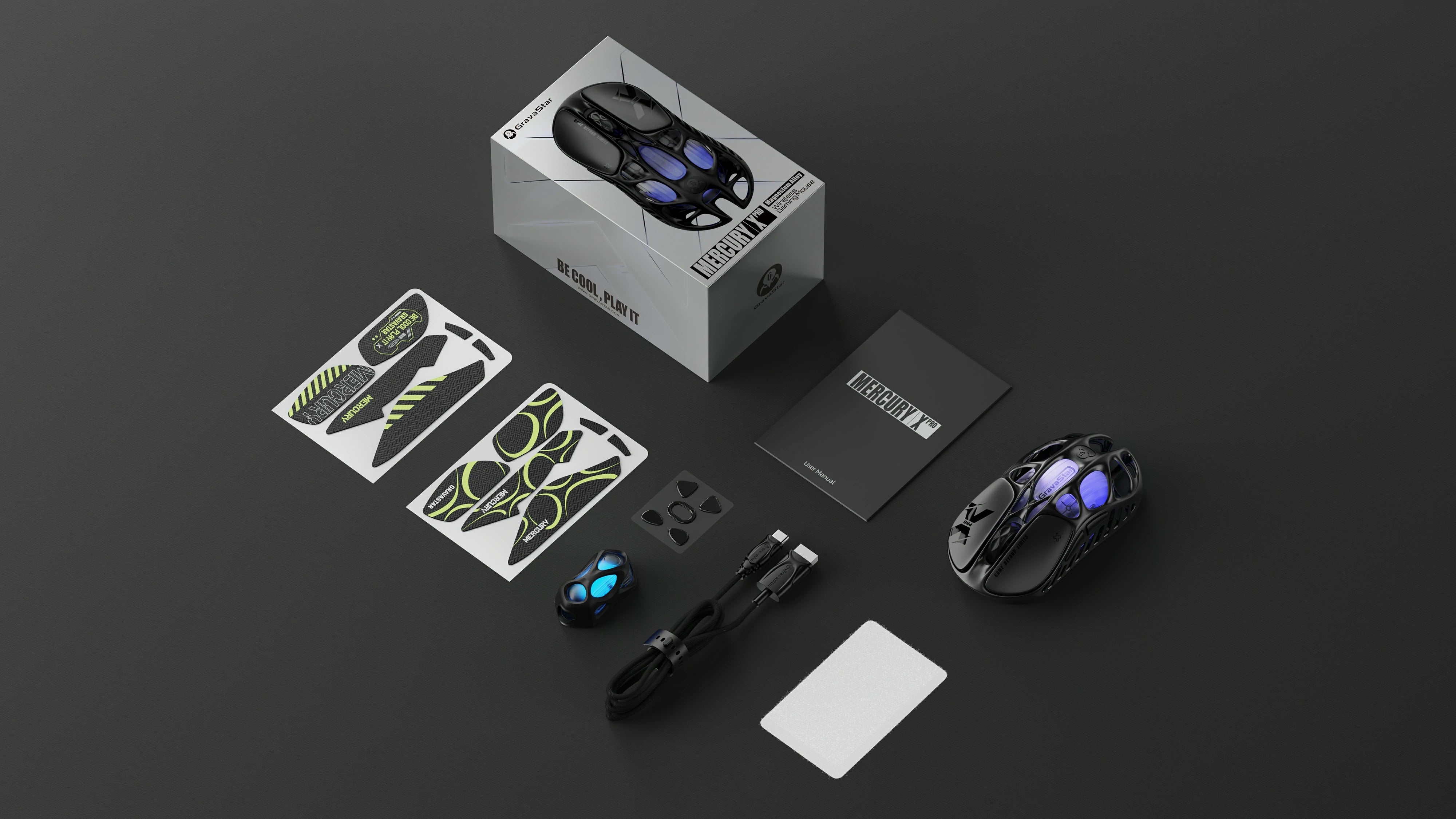 마우스, 8K 동글, 1.5m 케이블, 커스텀 스티커, 풋 패드(여분)