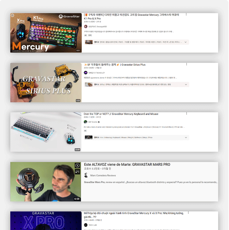GravaStar는 다양한 분야의 전문 디자이너, 엔지니어, 아티스트들이 만들어가고 있는 브랜드 입니다. 미래지향적 디자인과 첨단 기술을 결합한 가치로 2024 Red Dot, 2025 IF 디자인 어워드를 수상하며 전 세계인의 사랑을 받고 있습니다. GravsStar의 도전은 오늘도 계속됩니다!