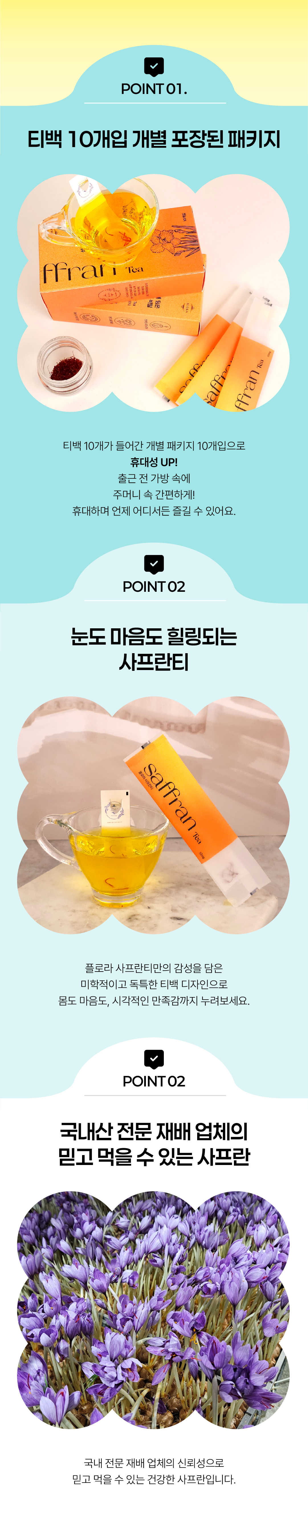 엄선된 고품질 사프란을 사용하여, 깊고 풍부한 향과 맛을 제공합니다. 천연의 색과 향을 그대로 담아낸 사프란티로 특별한 티타임을 즐기세요.