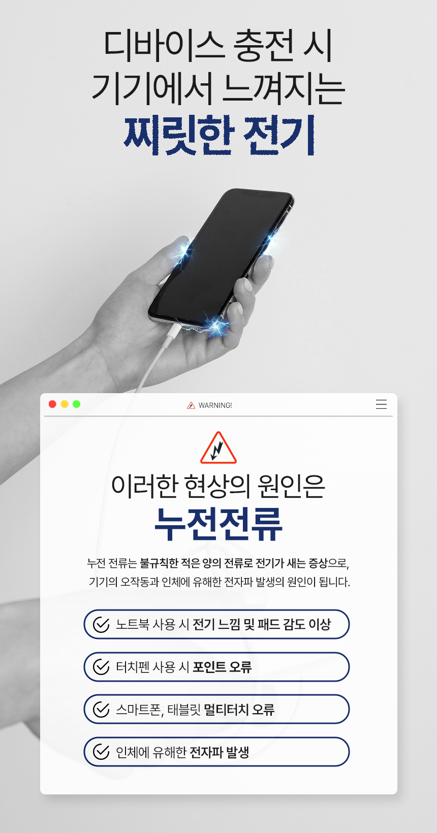 찌릿한 전기느낌은 없애고, 전자파 발생을 억제하는 최신 3핀 접지 설계.