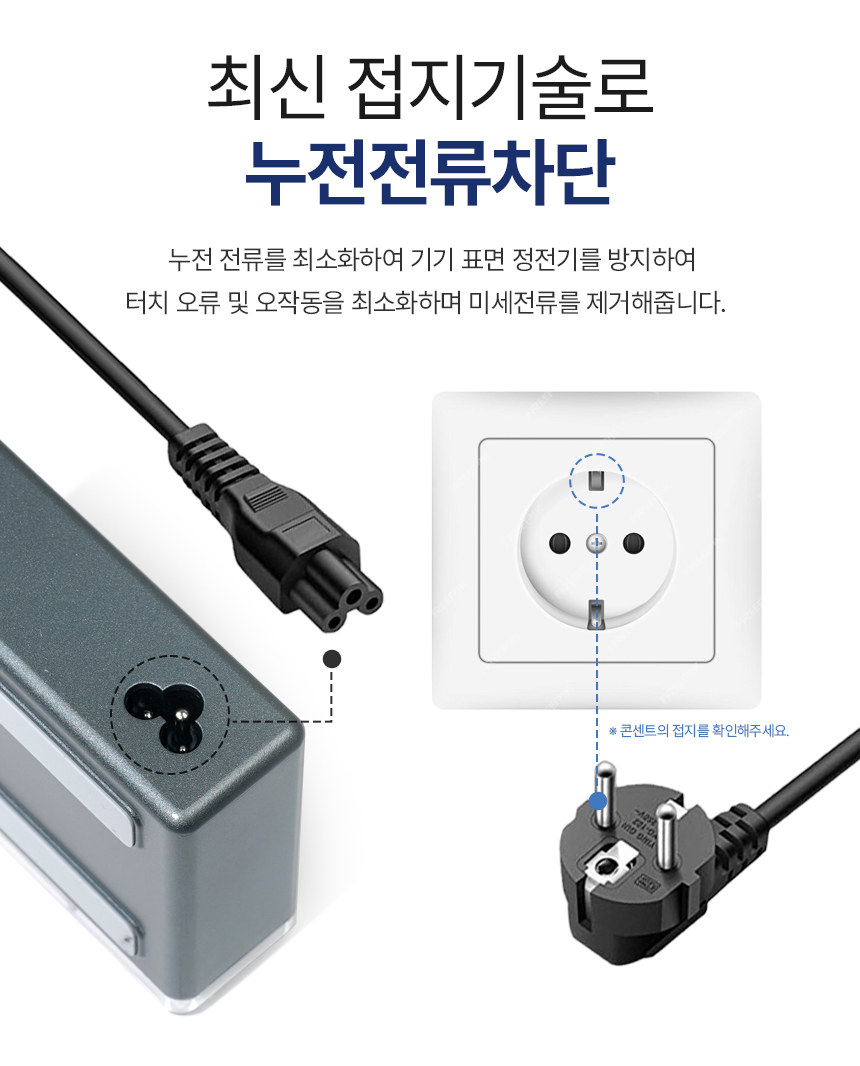안정적인 환경에서 노트북, 태블릿 등 다양한 기기들을 마음껏 사용해보세요. 3핀 접지 설계를 하여 누전 전류를 방출시켜 잔류 전기, 터치 오작동 및 전자파를 억제할 수 있습니다.
