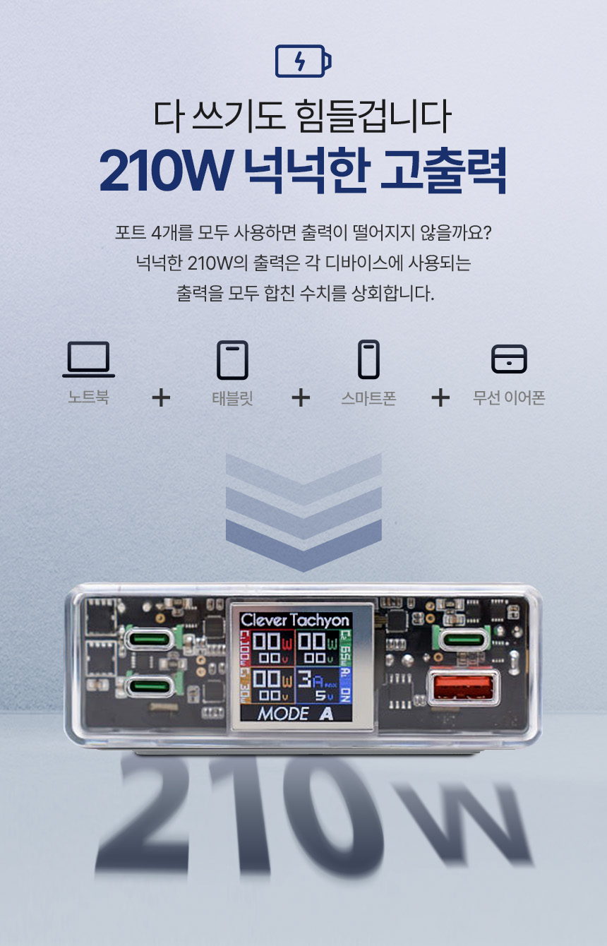 고성능 노트북, 태블릿 , 스마트폰,이어폰등을 한 번에 다 충전해도 거뜬한 괴물같은 출력 210W