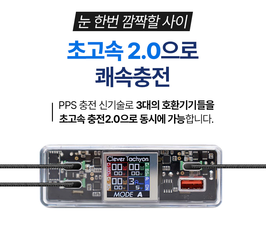 클레버 타키온은 내부가 보이는 사이버 펑크 디자인으로 설계되었습니다. 회로들과 각종 전자 부품들로 채워진 전면부는 보는 것만으로도 즐거움을 선사합니다. 내장된 디지털 컬러 디스플레이는 각 포트의 충전 와트와 전압이 표시되어 연결된 디바이스의 충전 사양에 적합하게 충전이 되는 지 실시간으로 확인 할 수 있습니다.
