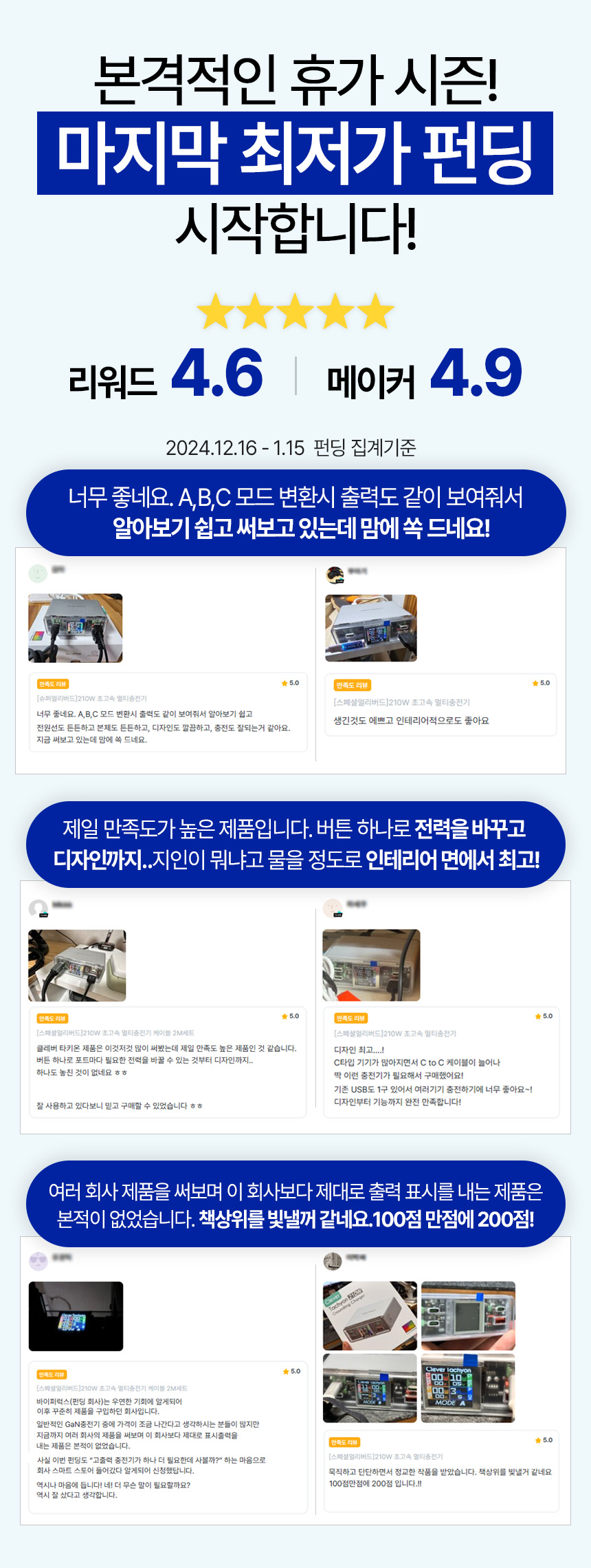 A. 시중에 멀티포트 충전기들은 여러대 충전시 각포트에 따른 전력분배로 인해 충전을 일순간 멈췄다 다시 진행되는 일종의 재부팅 현상이 발생됩니다. 본 펀딩 제품은 Ai 스마트 출력 설계로 그런 재부팅 현상은 없으며 모드 변경시에도 재부팅 현상은 발생되지 않습니다.