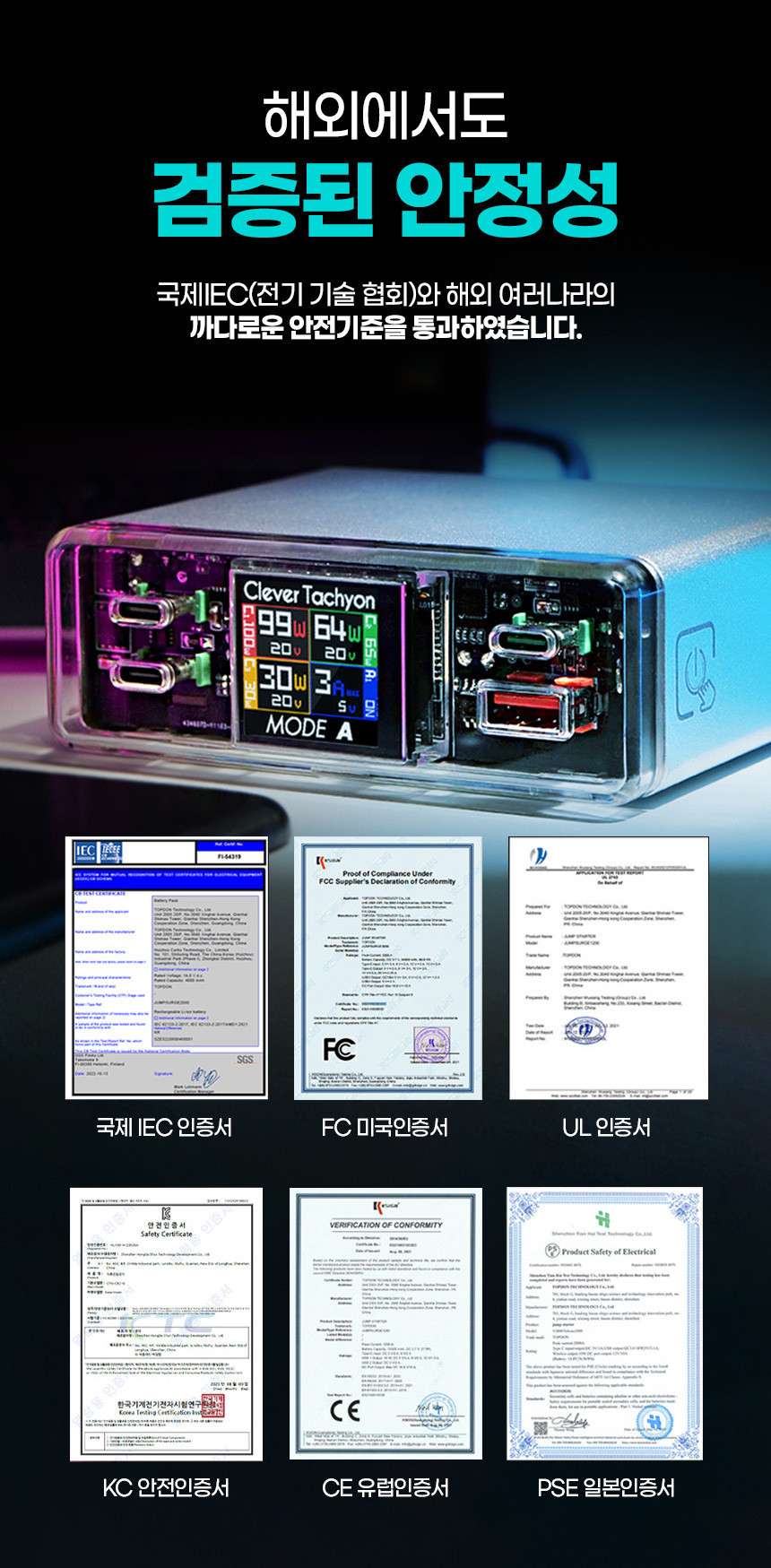 클레버 충전기는 국제 IEC(국제 전기 기술 위원회)인증및 해외 여러나라의 까다로운 안전기준을 통과하여 성능을 검증 받았습니다.
