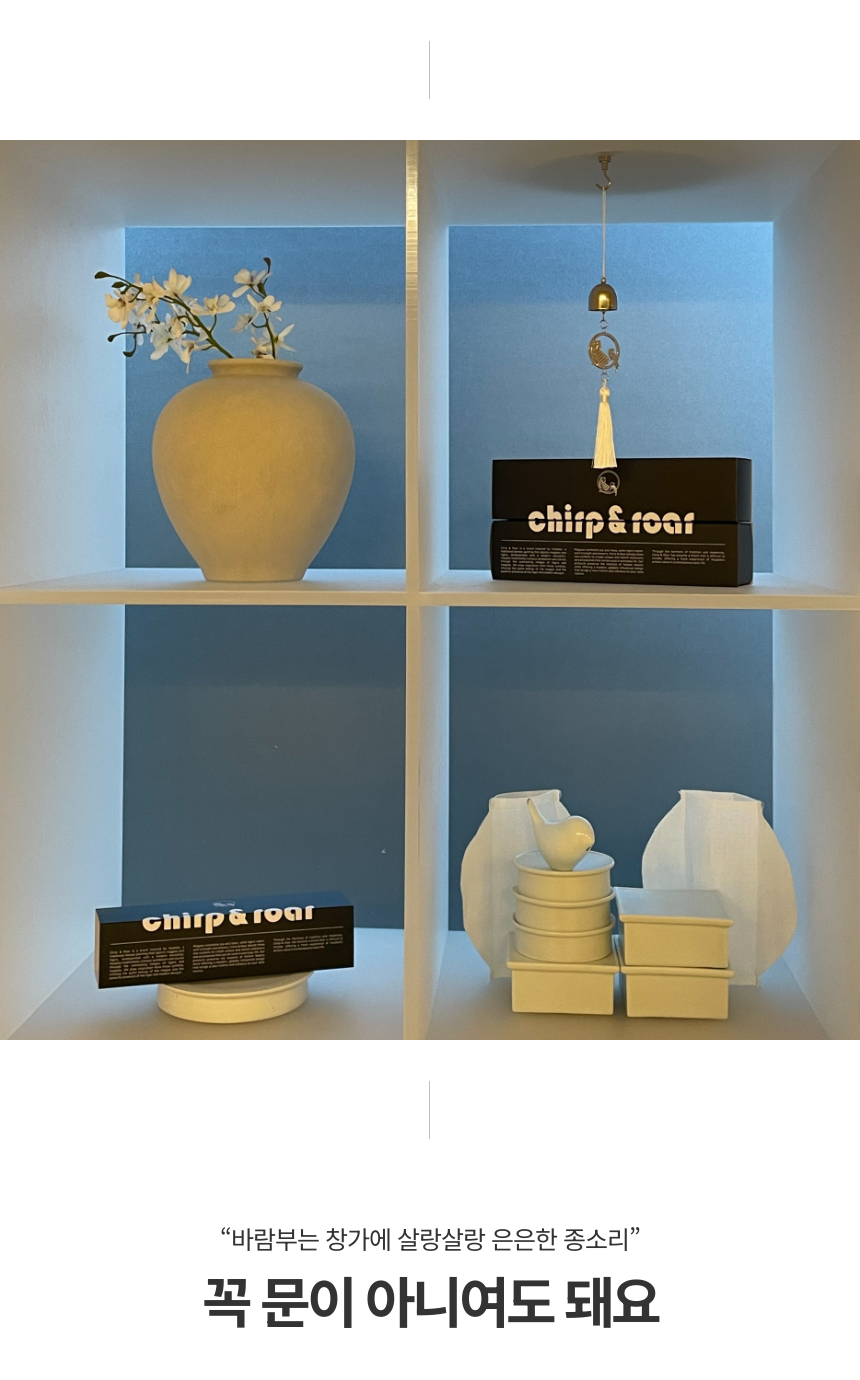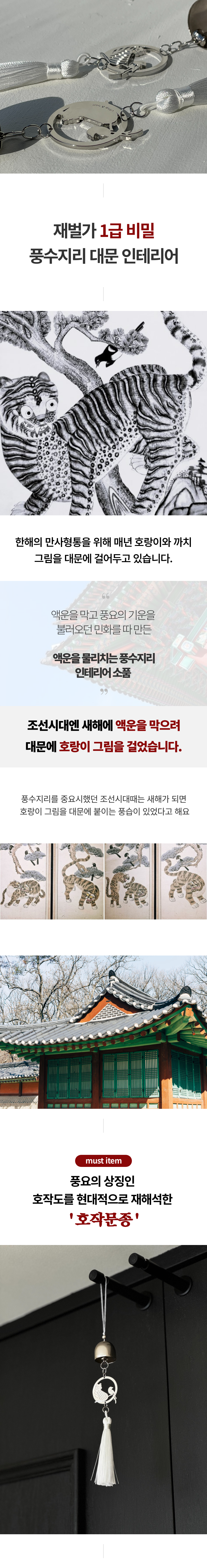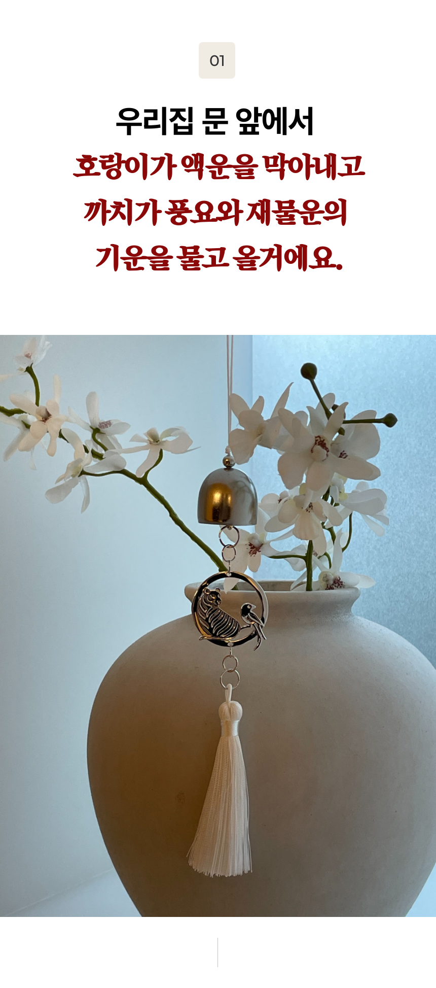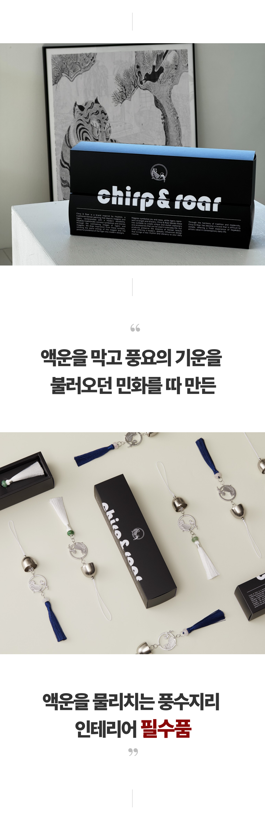 - “우리 집 문 앞에 복을 걸어요.” 철프앤로어는 잊혀진 전통 속 행운의 상징 호작도에서 영감을 받아, 현대적인 감각의 인테리어 소품인 호작문종을 만들게 되었습니다.복을 물고 온다는 까치와, 액운을 물리치는 호랑이가 함께 그려진 호작도는 예로부터 새해 대문에 걸어두던 그림이었어요.그 이야기를 요즘의 감성으로 재해석해, 누구나 일상 속에서 쉽게 걸 수 있는 행운의 장식 으로 만들고 싶었습니다.