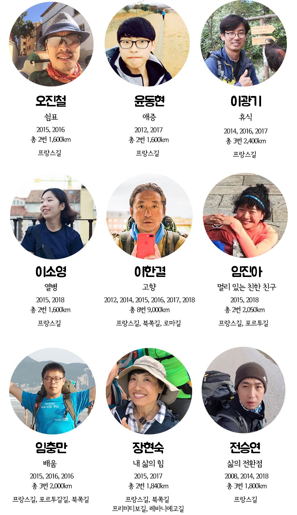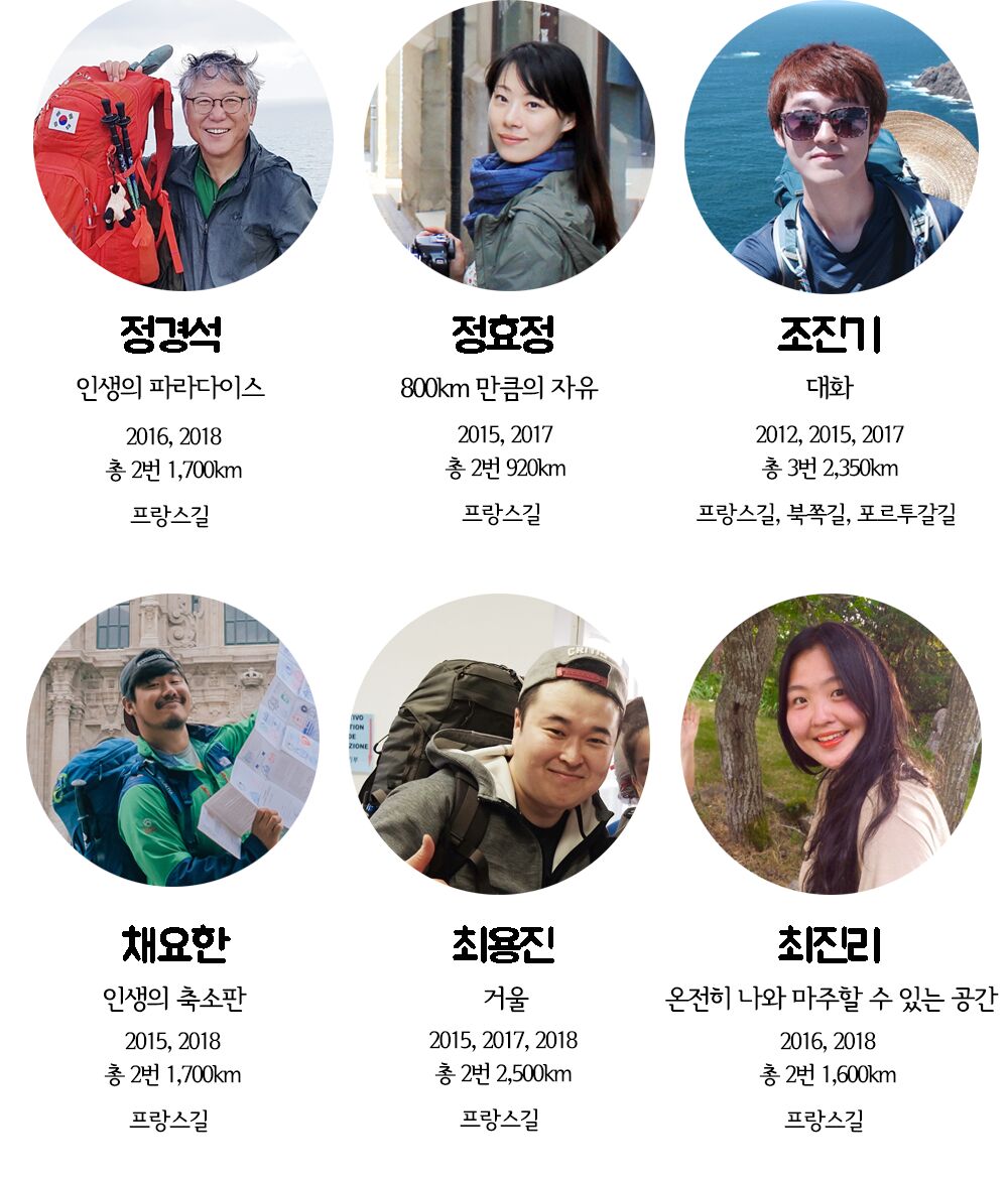 그래서 산다사 모임 안에서 그동안 소통하고 지내던 사람들 중 연령대에 관계없이 산티아고 순례길에 2번 이상 다녀온 사람들을 모아봤습니다.